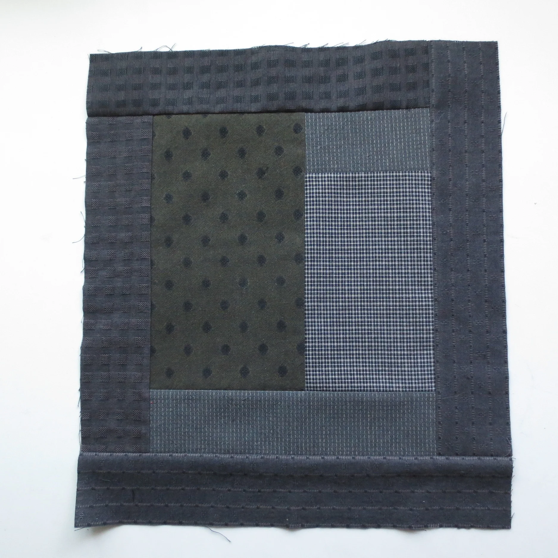 The background for both pillow designs is basically a Log Cabin block with a 3-piece center square. The block is made with seven different fabrics, A-G. I used various woven fabrics and a bit of red print from my stash.