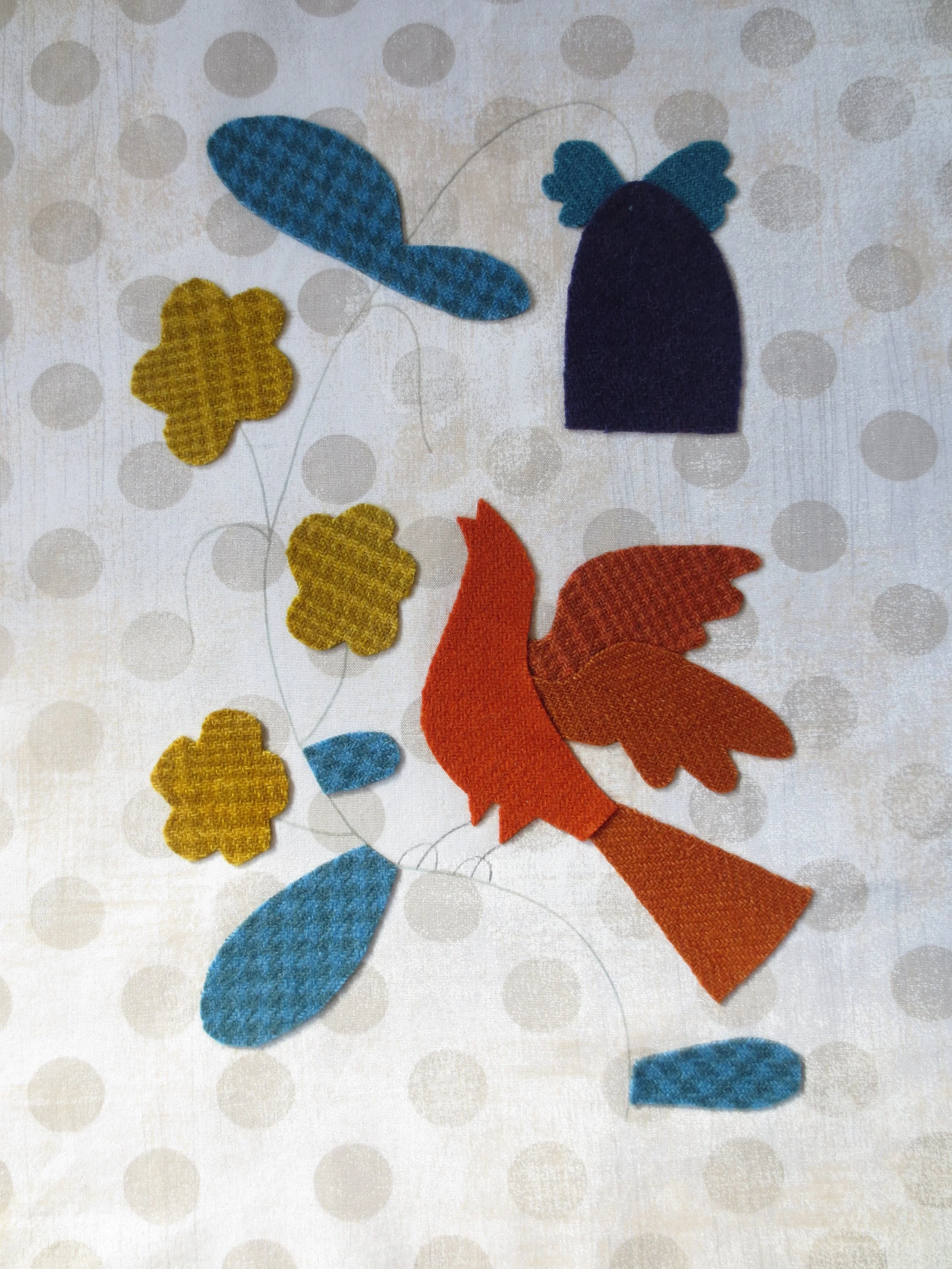 5. Using the layout as your guide place the bird’s body, tail, wings, leaves, flowers, bell flower and bell flower sepals onto the background. Fuse in place. Make sure you iron the back also to insure adhesion.