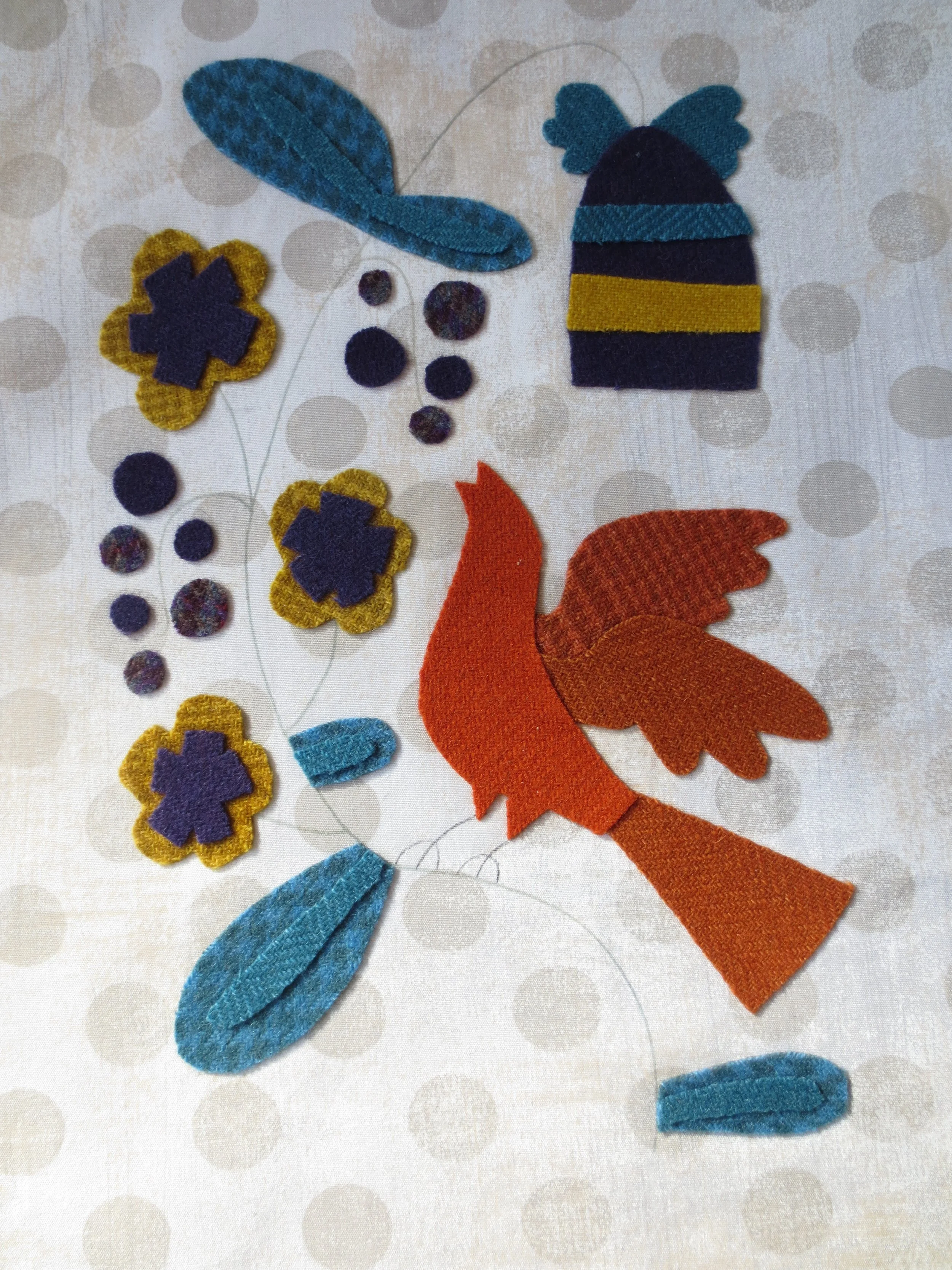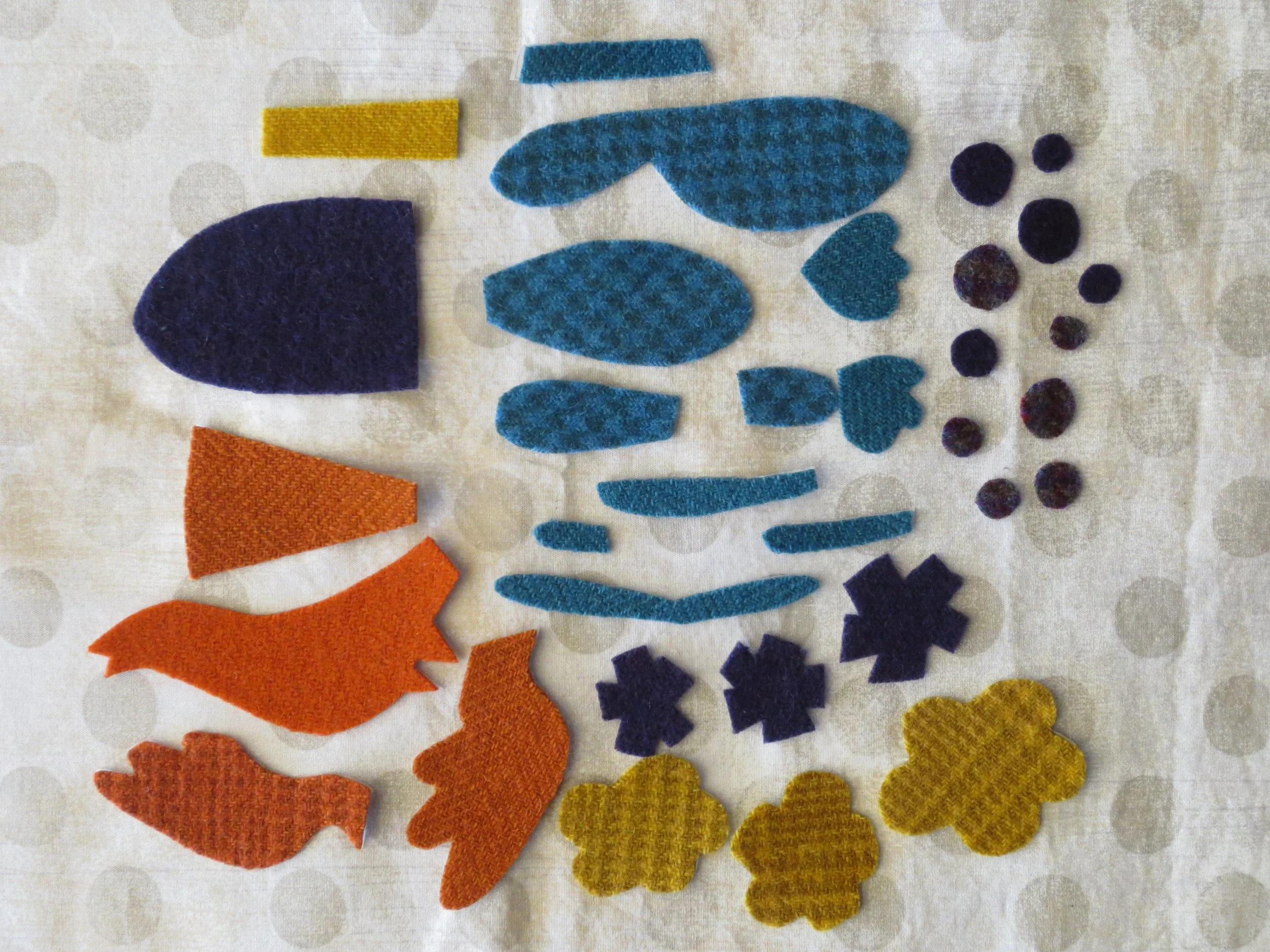 Fuse patterns to designated wools, and then cut out along traced lines. Set wool pieces aside until needed.