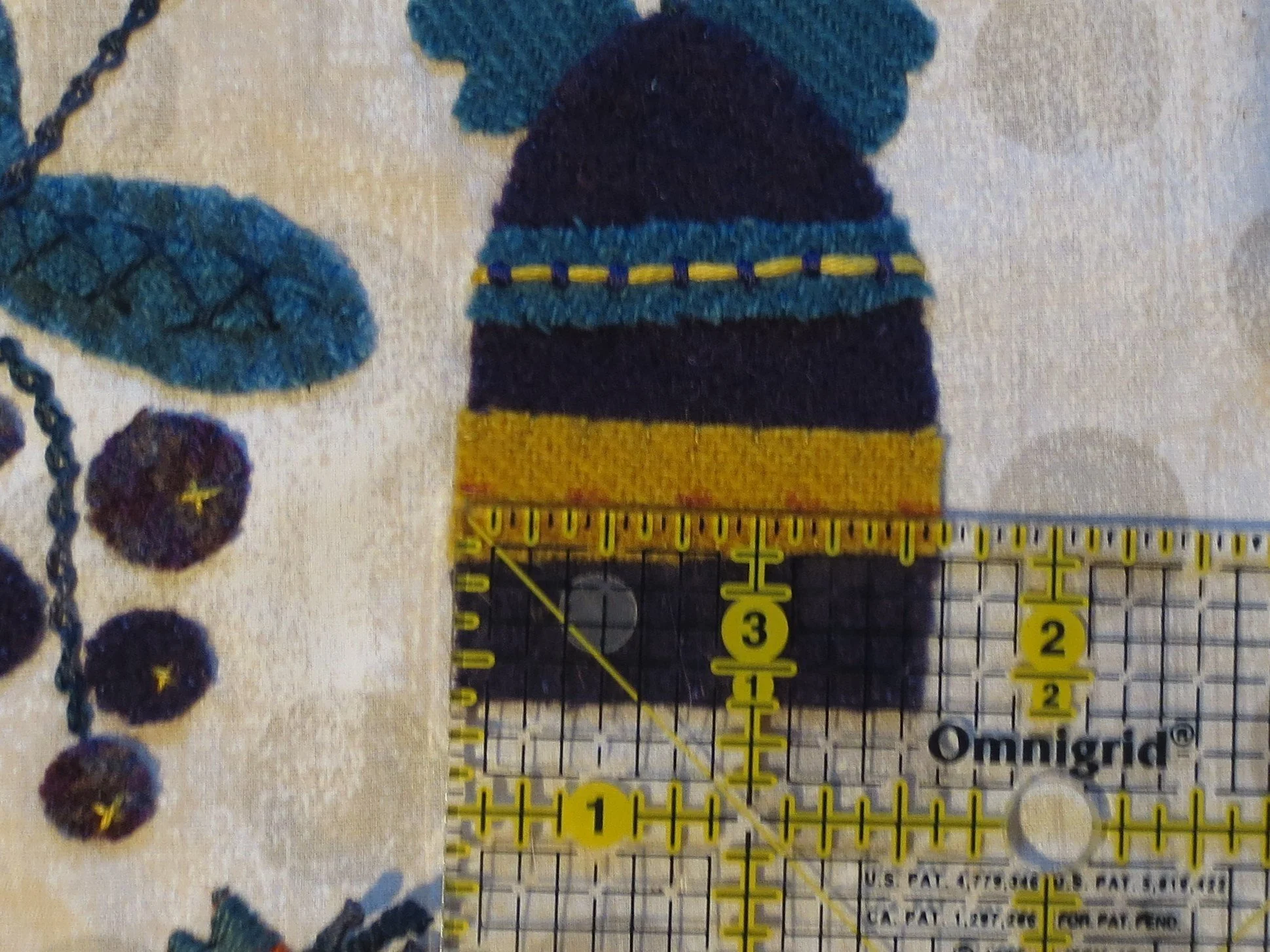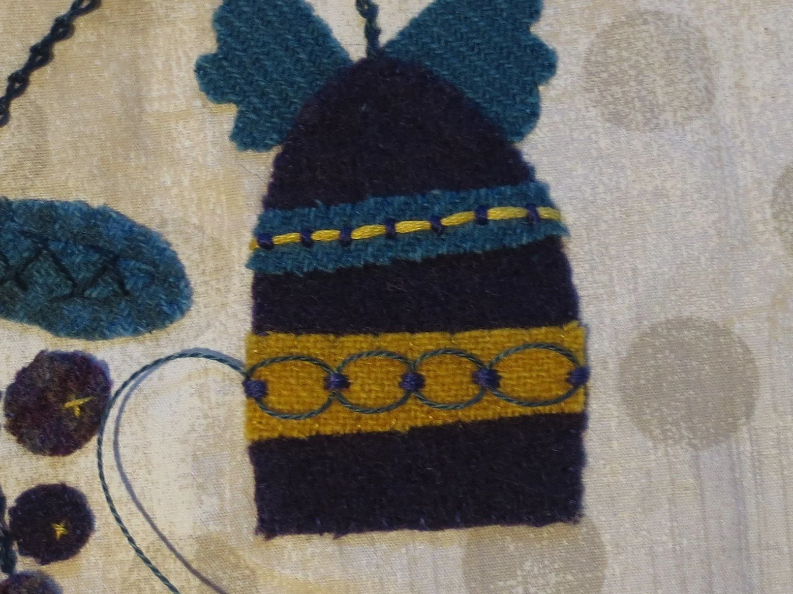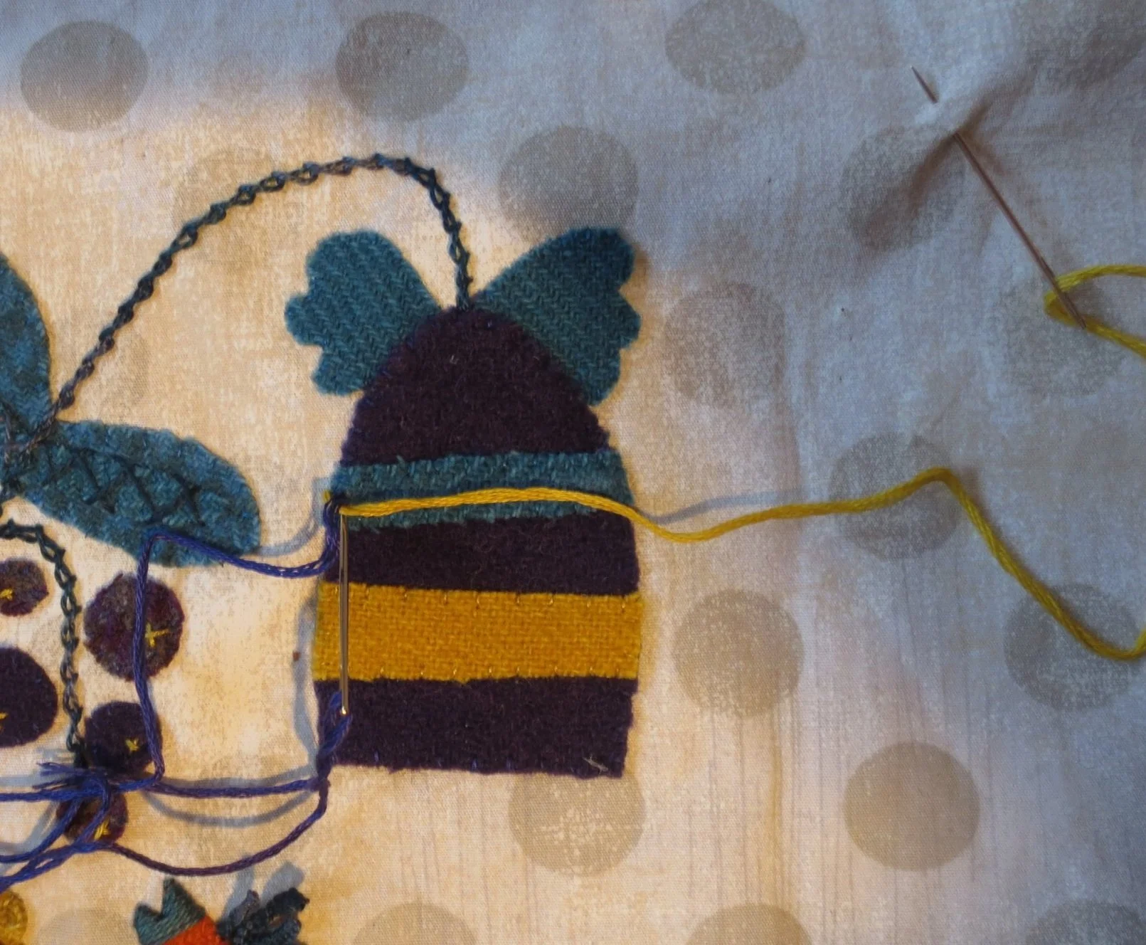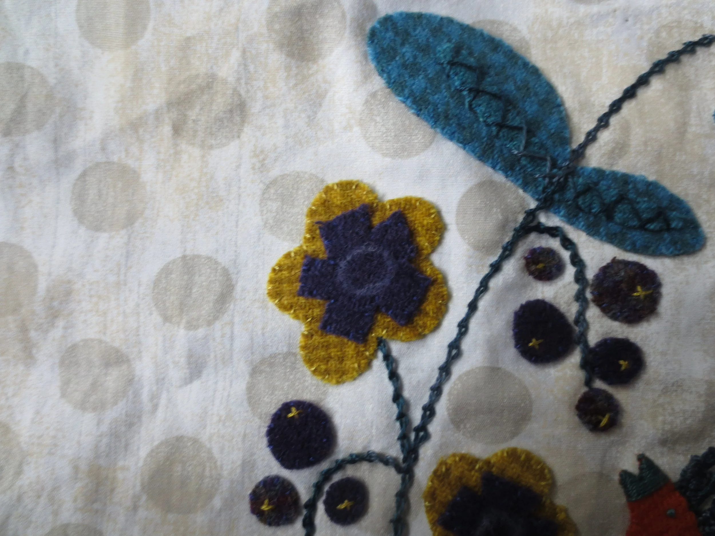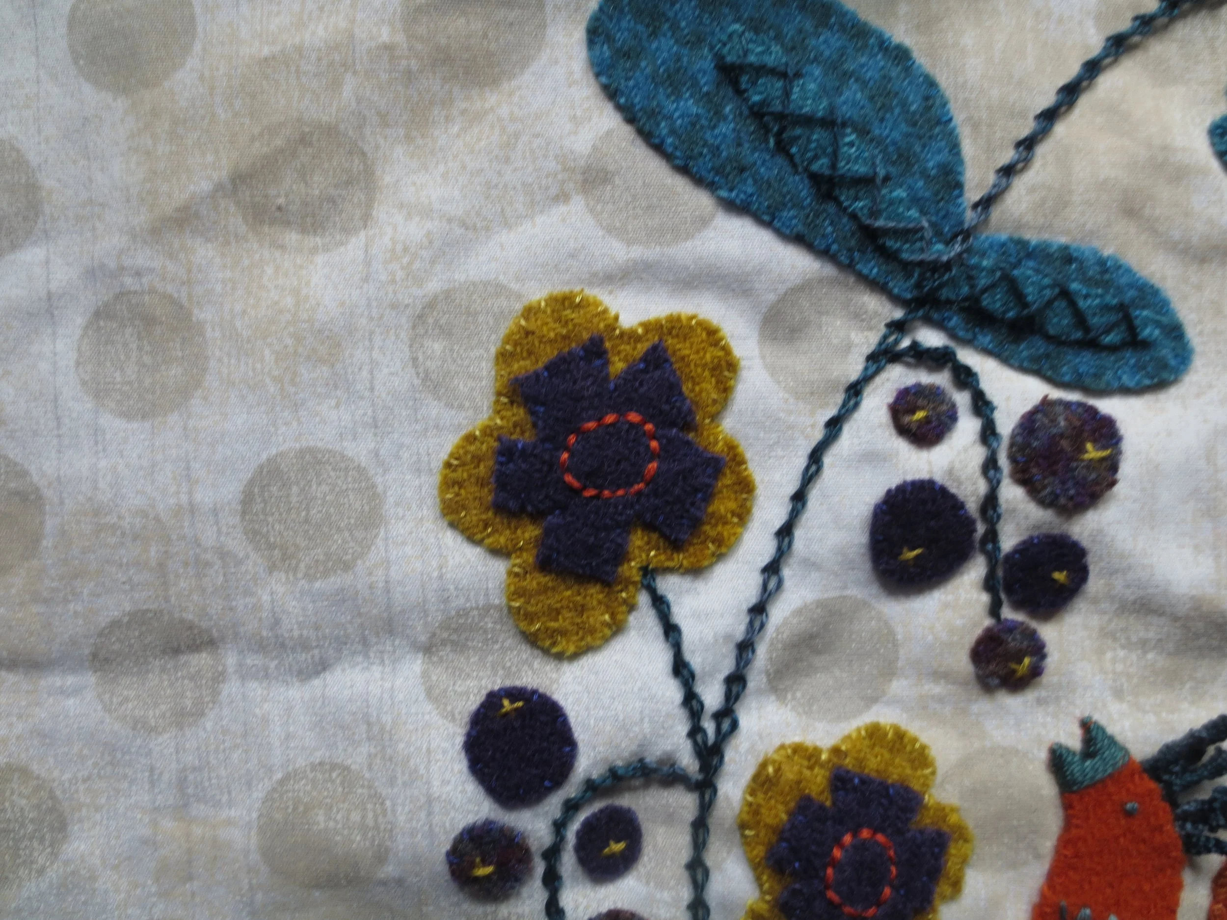 7. Use 2 strands of gold floss to make little X’s on each berry. This will secure them to the background. You can then whip stitch them in place using 1 strand of purple floss.