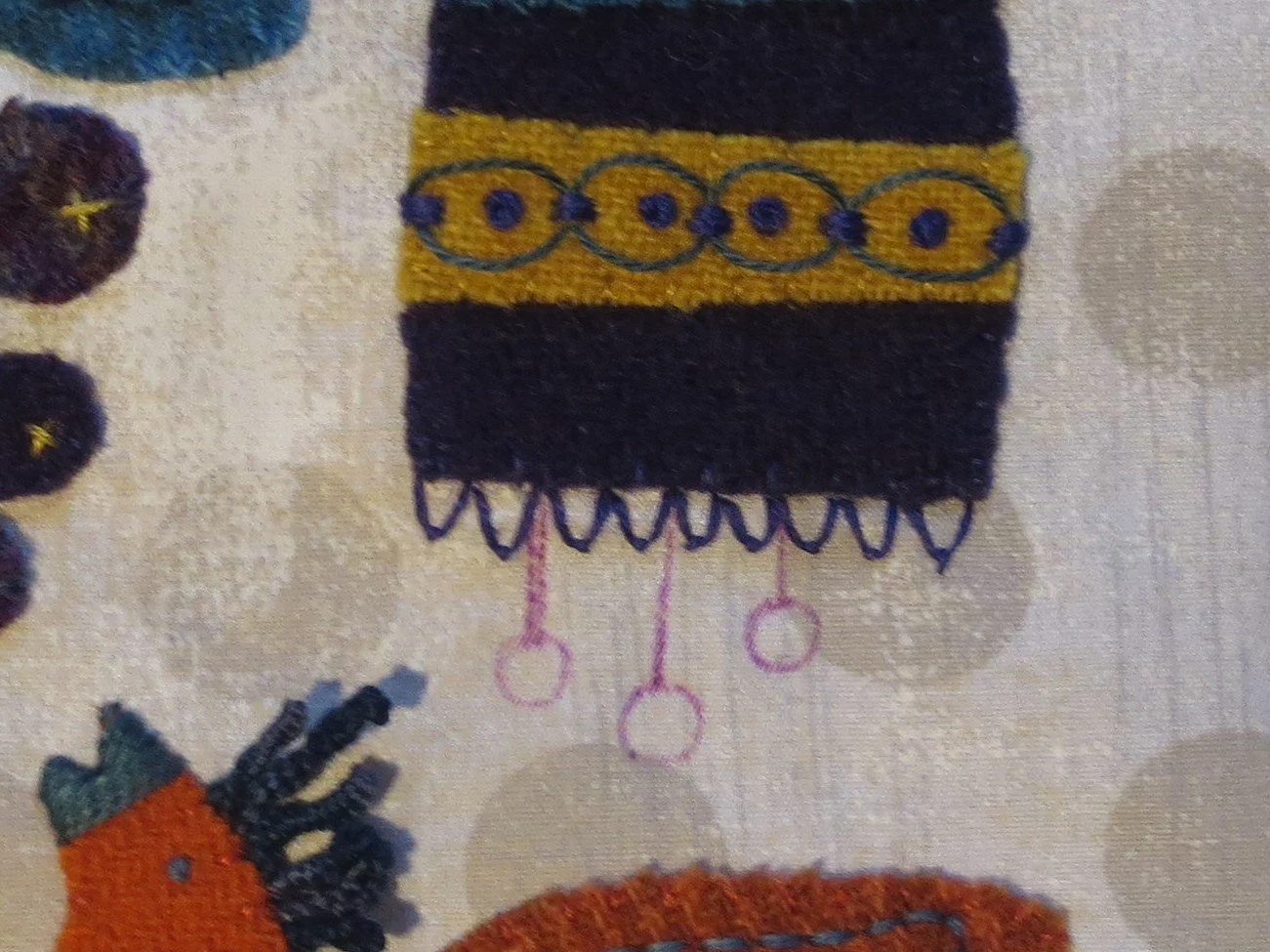 22. Use 3 strands of gold colored floss to stitch a series of French knots inside the orange circle.