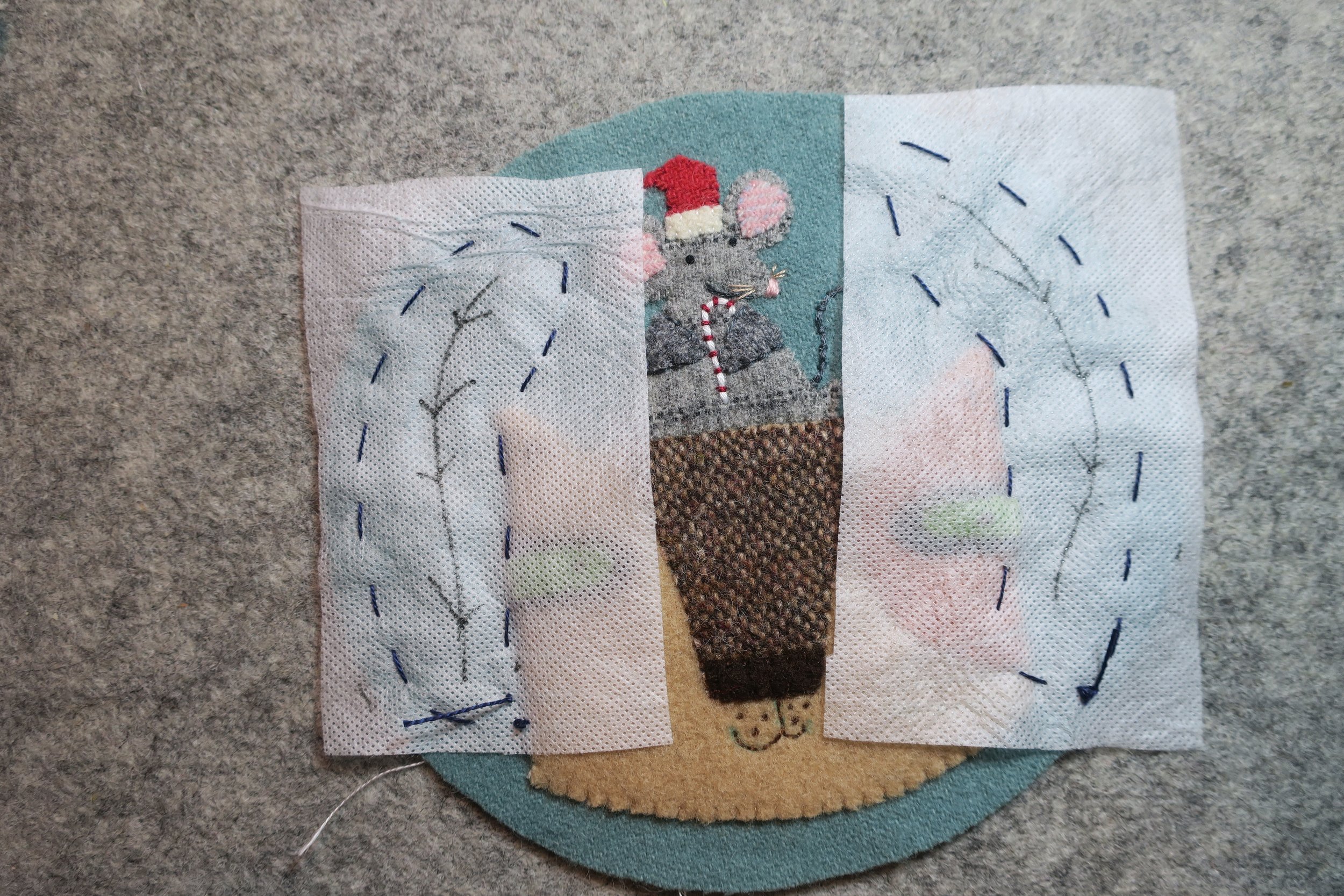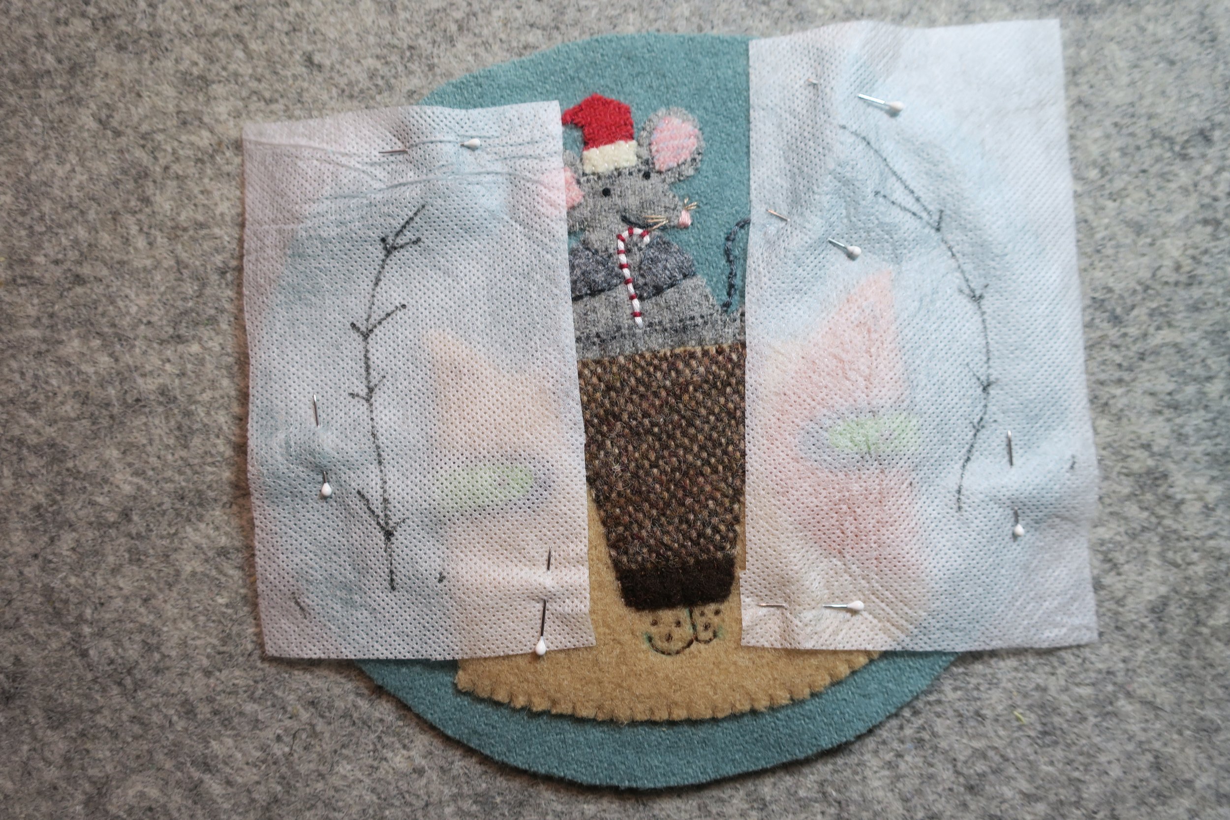 22. Transferring the holly stem can be done by simply drawing the stem onto the background using a water erasable marker and the layout as a guide or using washaway embroidery stabilizer which is more accurate. I used the drawing method with Winston, and the washaway stabilizer with Snickers. For those of you who want to use the stabilizer method, scroll down to step #55.