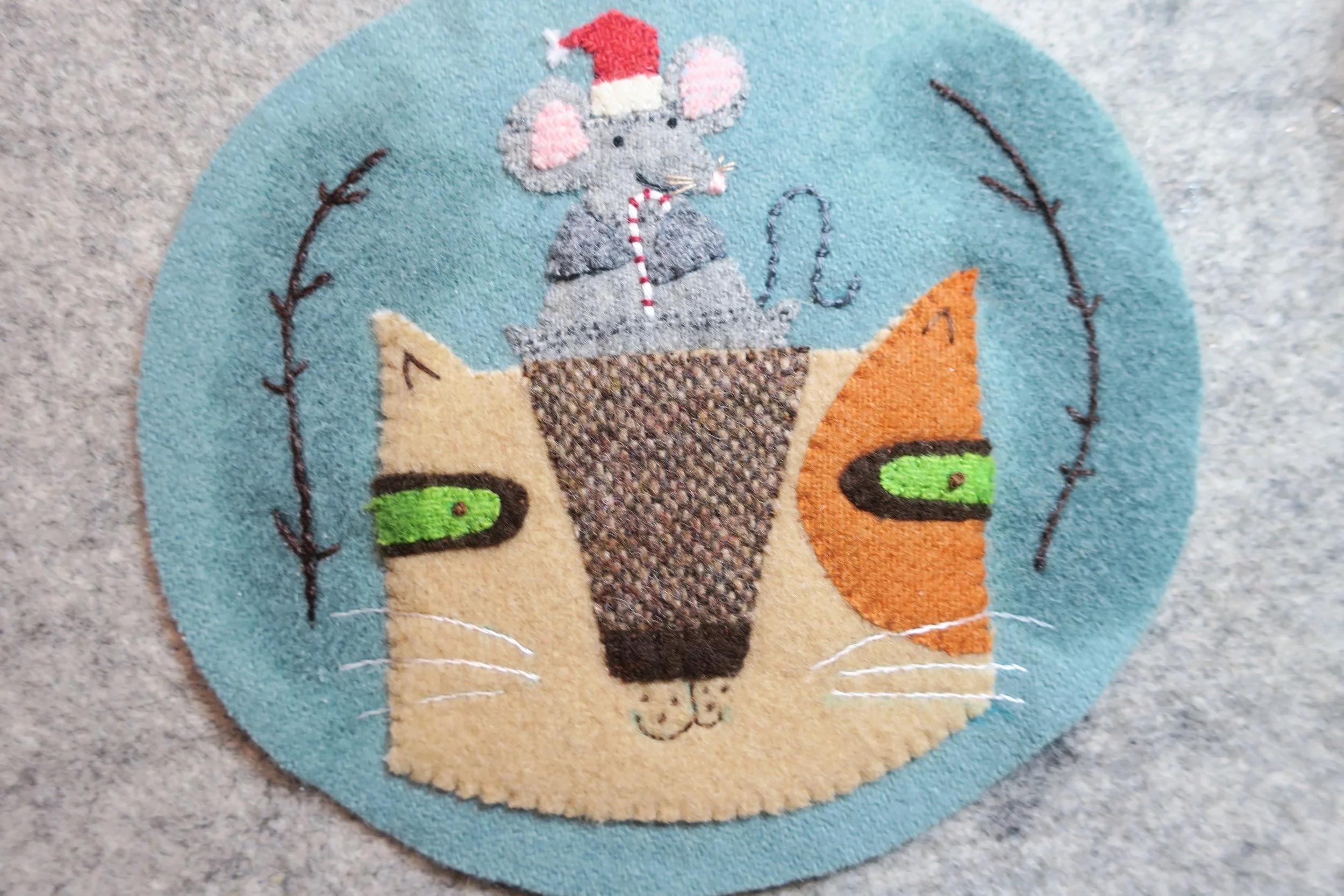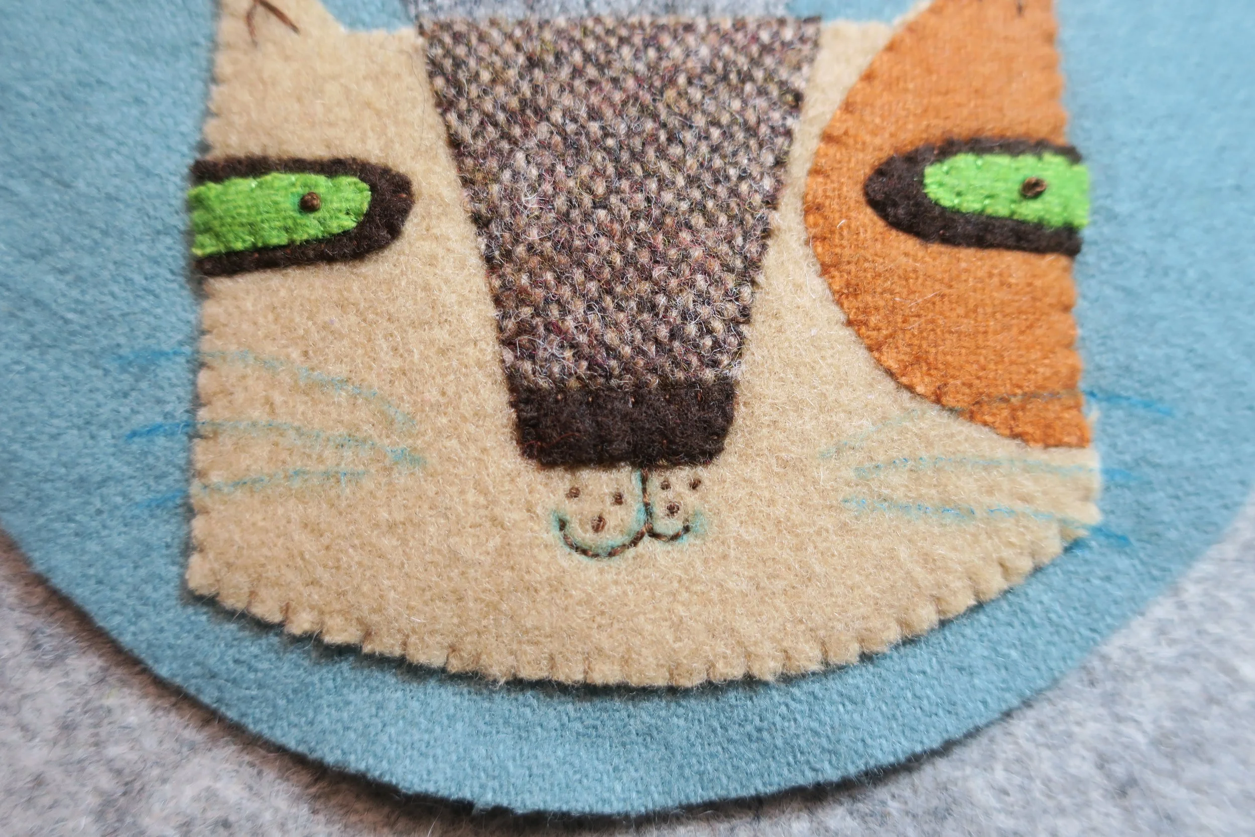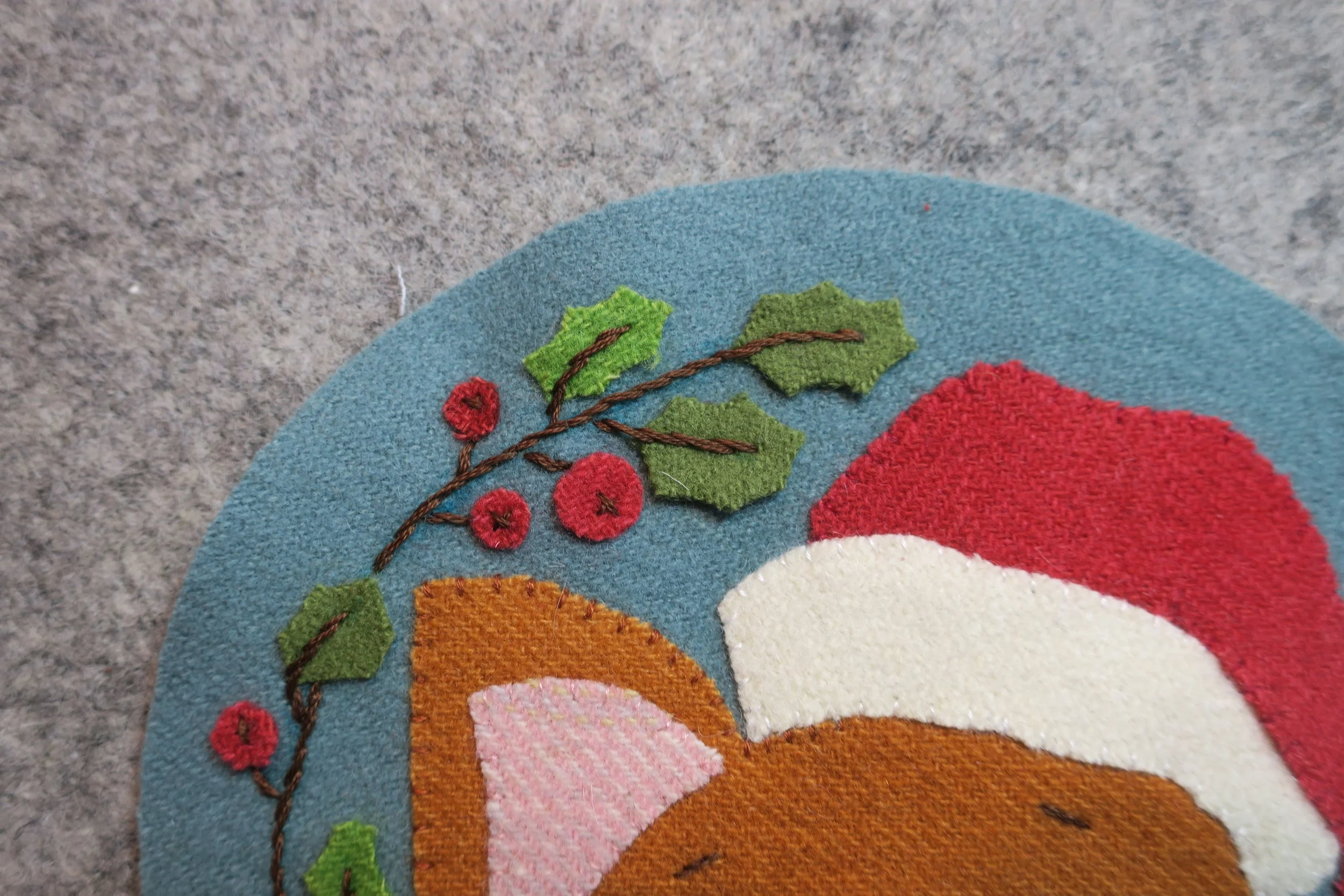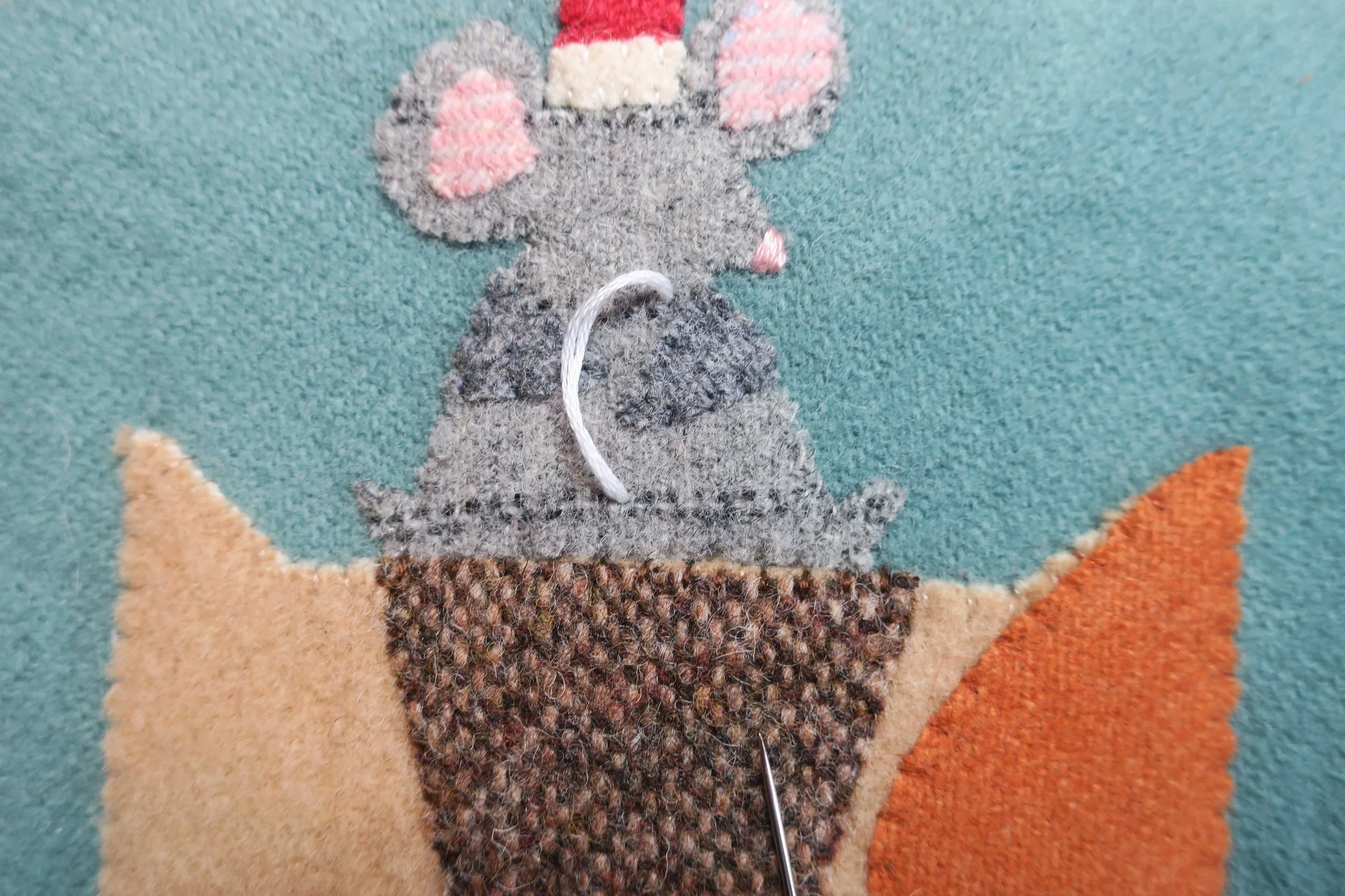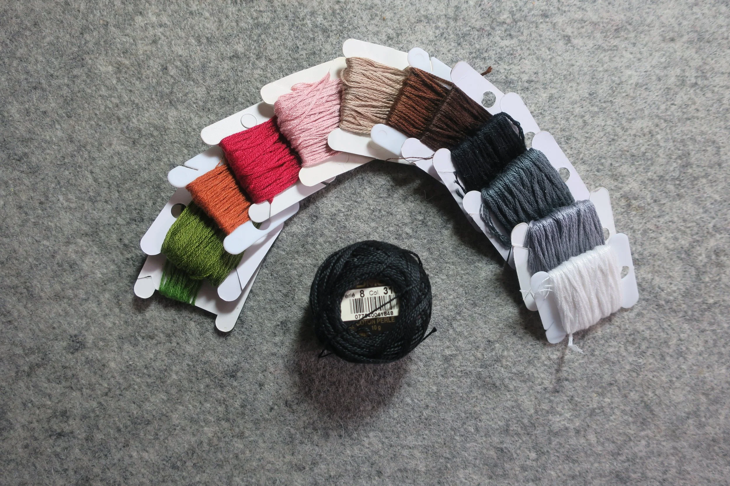 I used 6-strand embroidery floss for most of the stitching. The only exception is the blanket stitch border where I used black perle cotton, size 8. The floss threads match my wool colors.