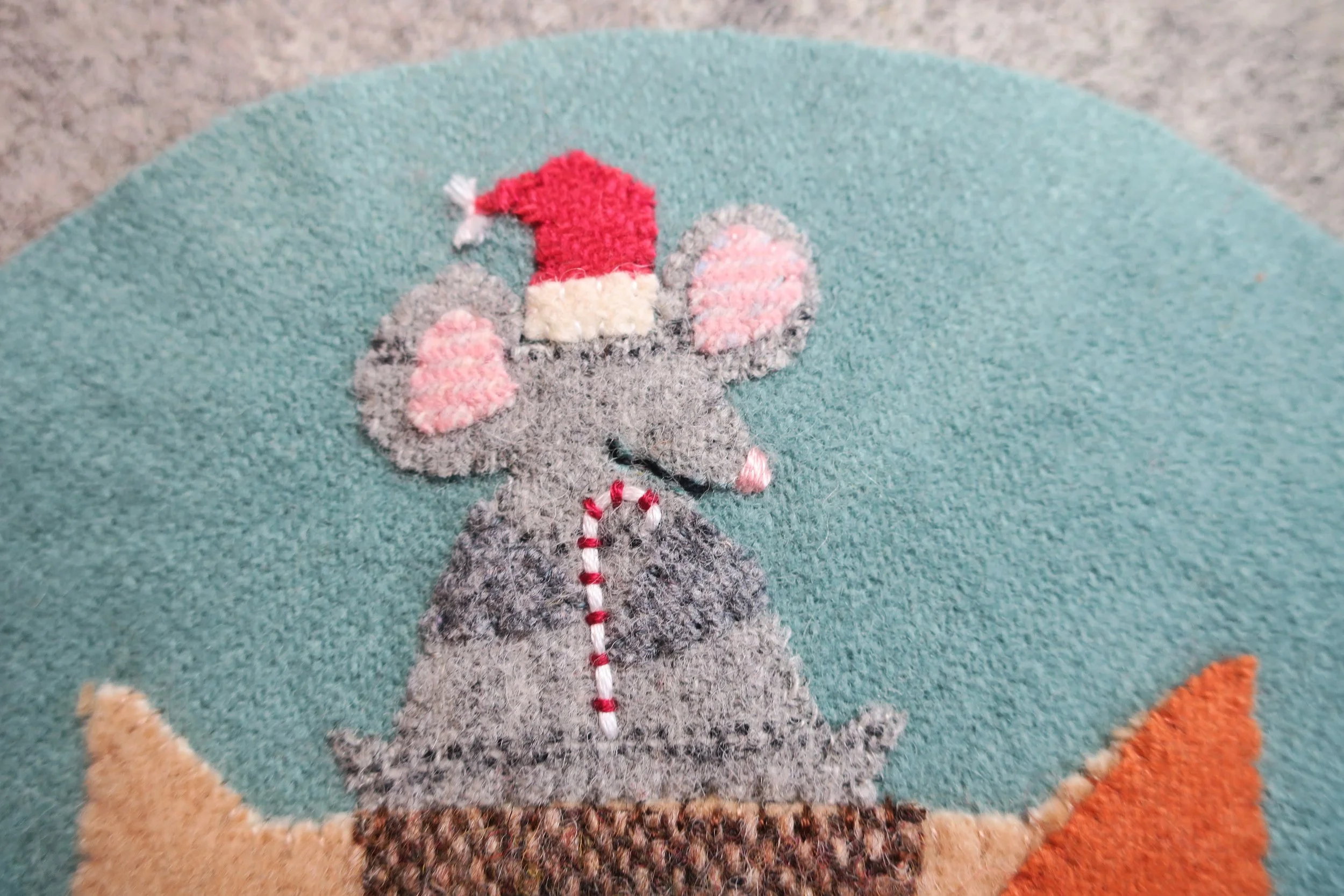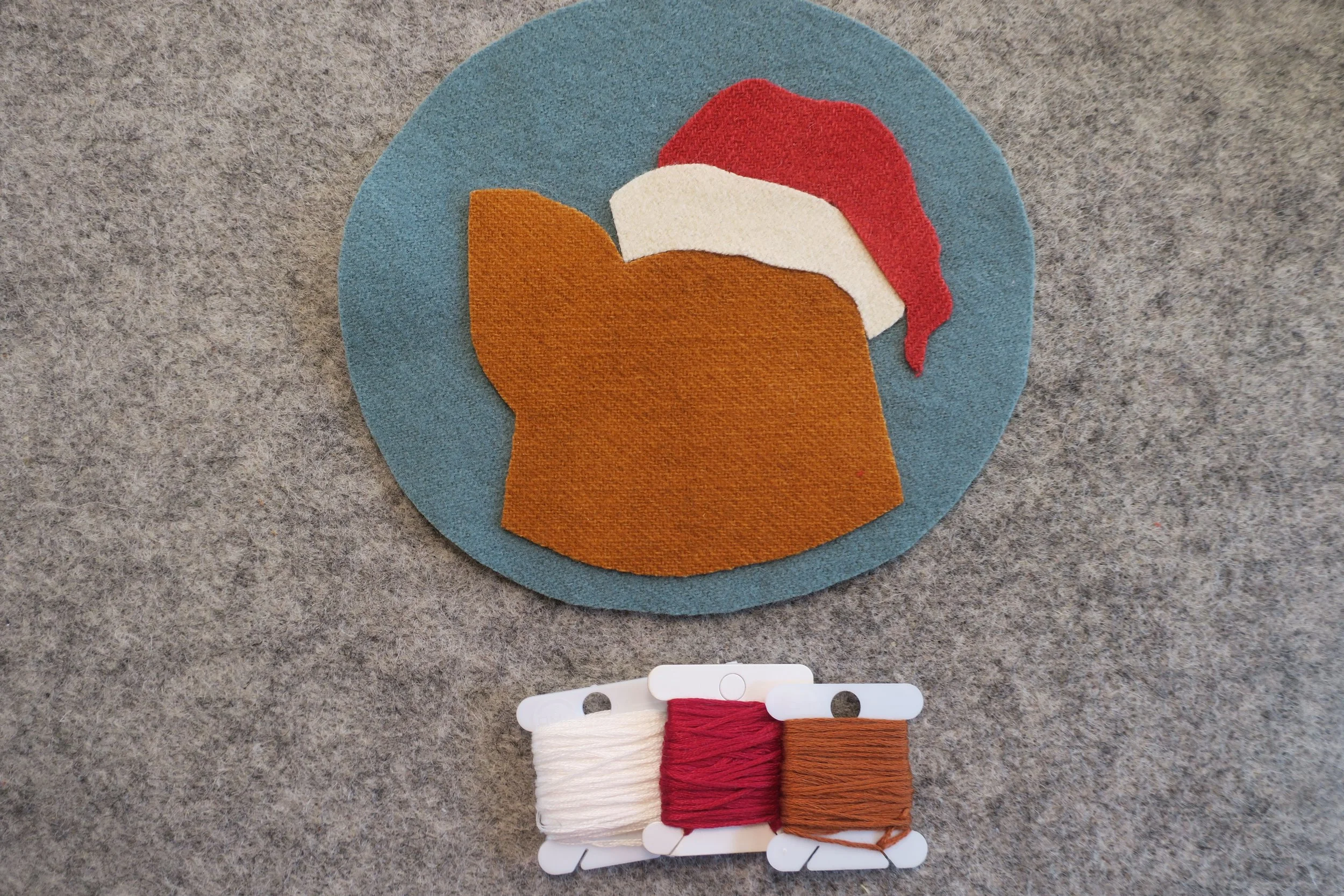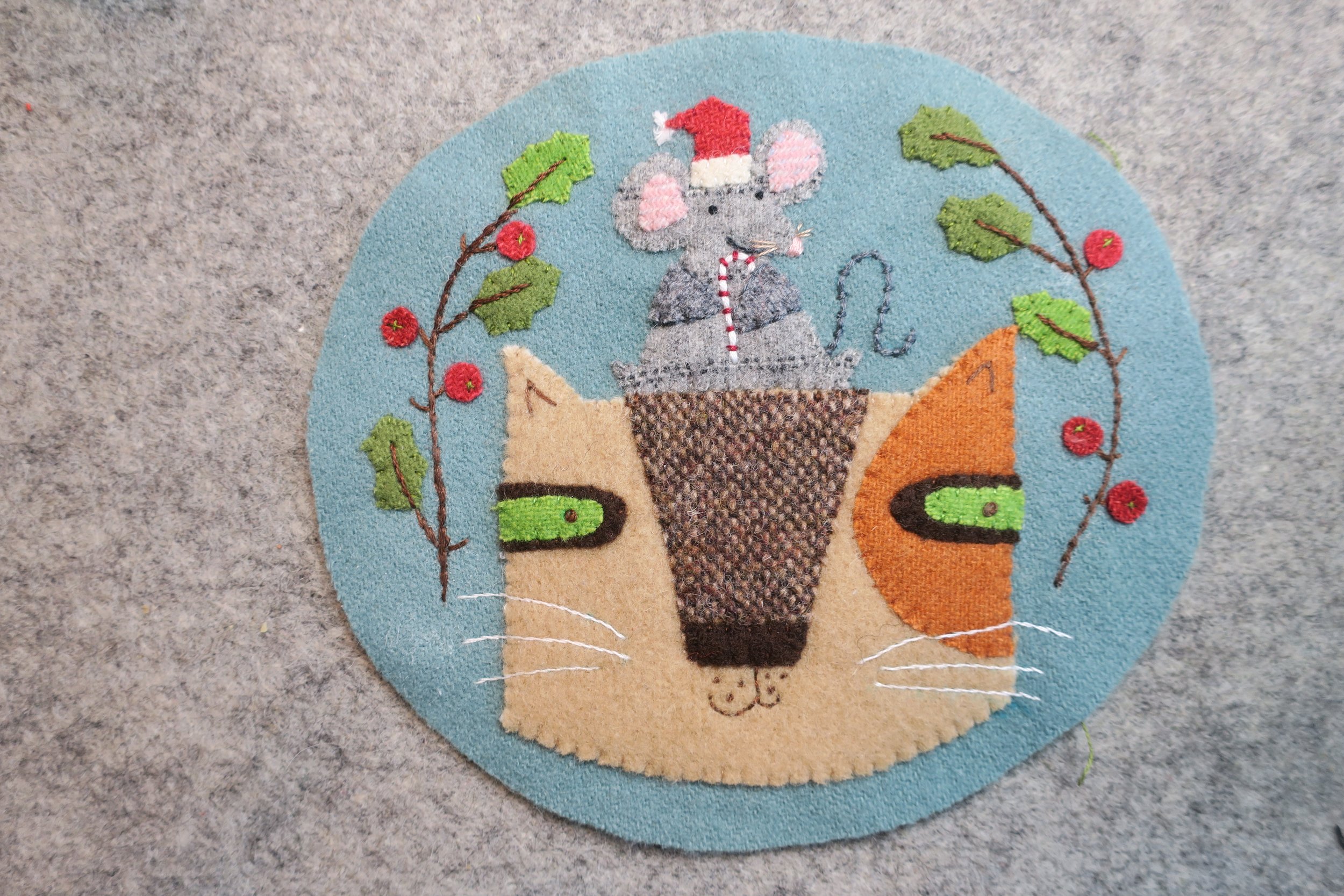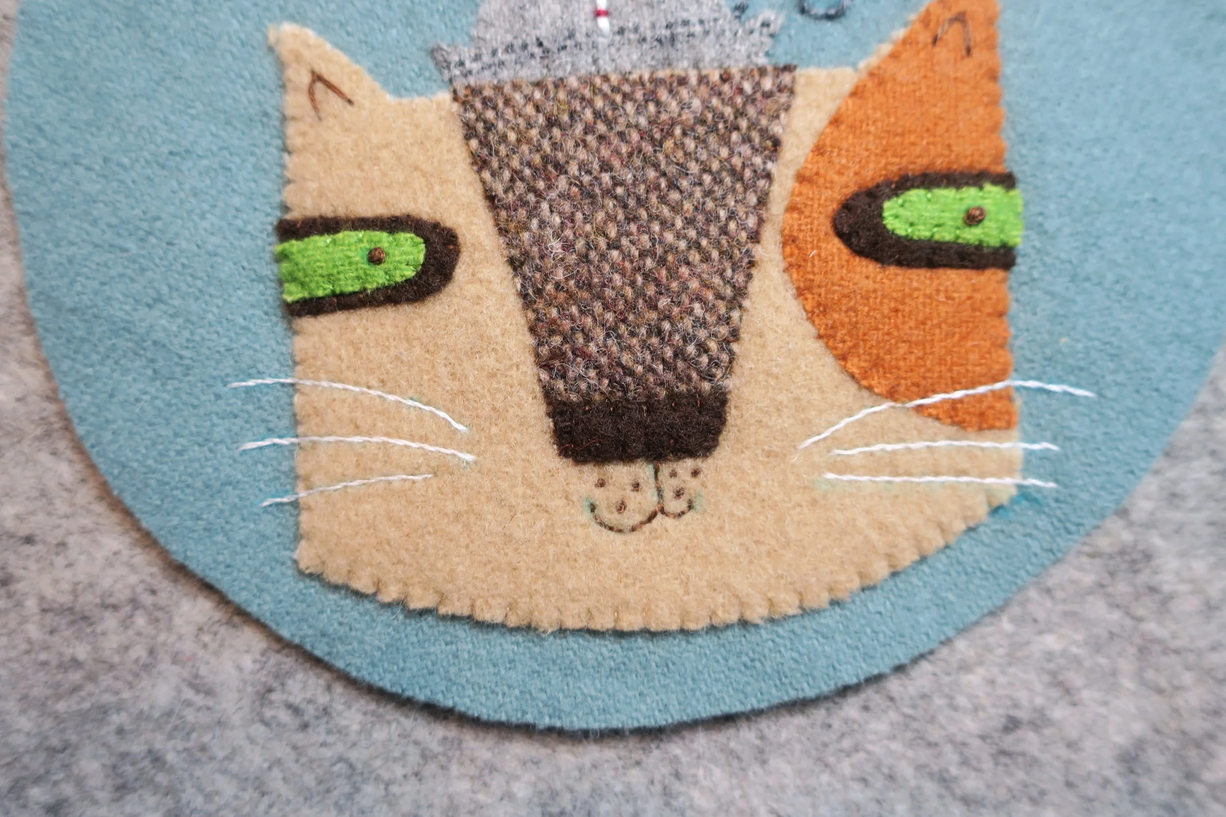 I used 6-strand embroidery floss for most of the stitching. The only exception is the blanket stitch border where I used black perle cotton, size 8. The floss threads match my wool colors.