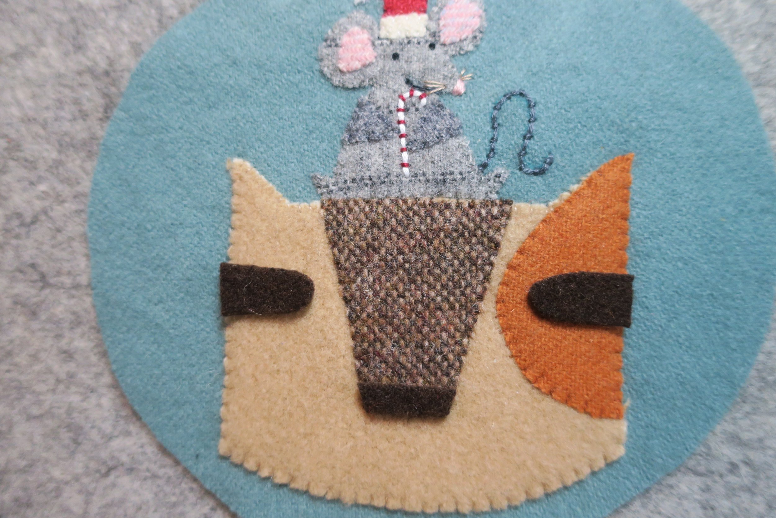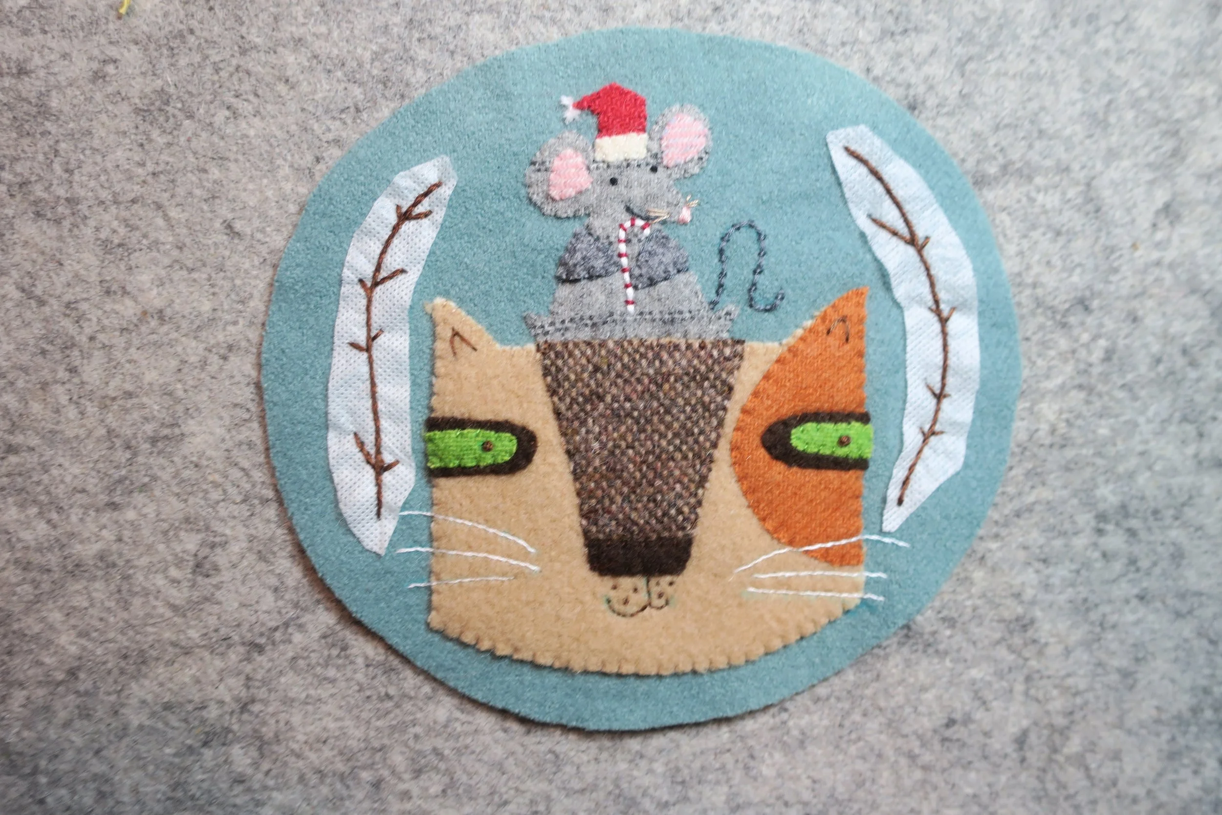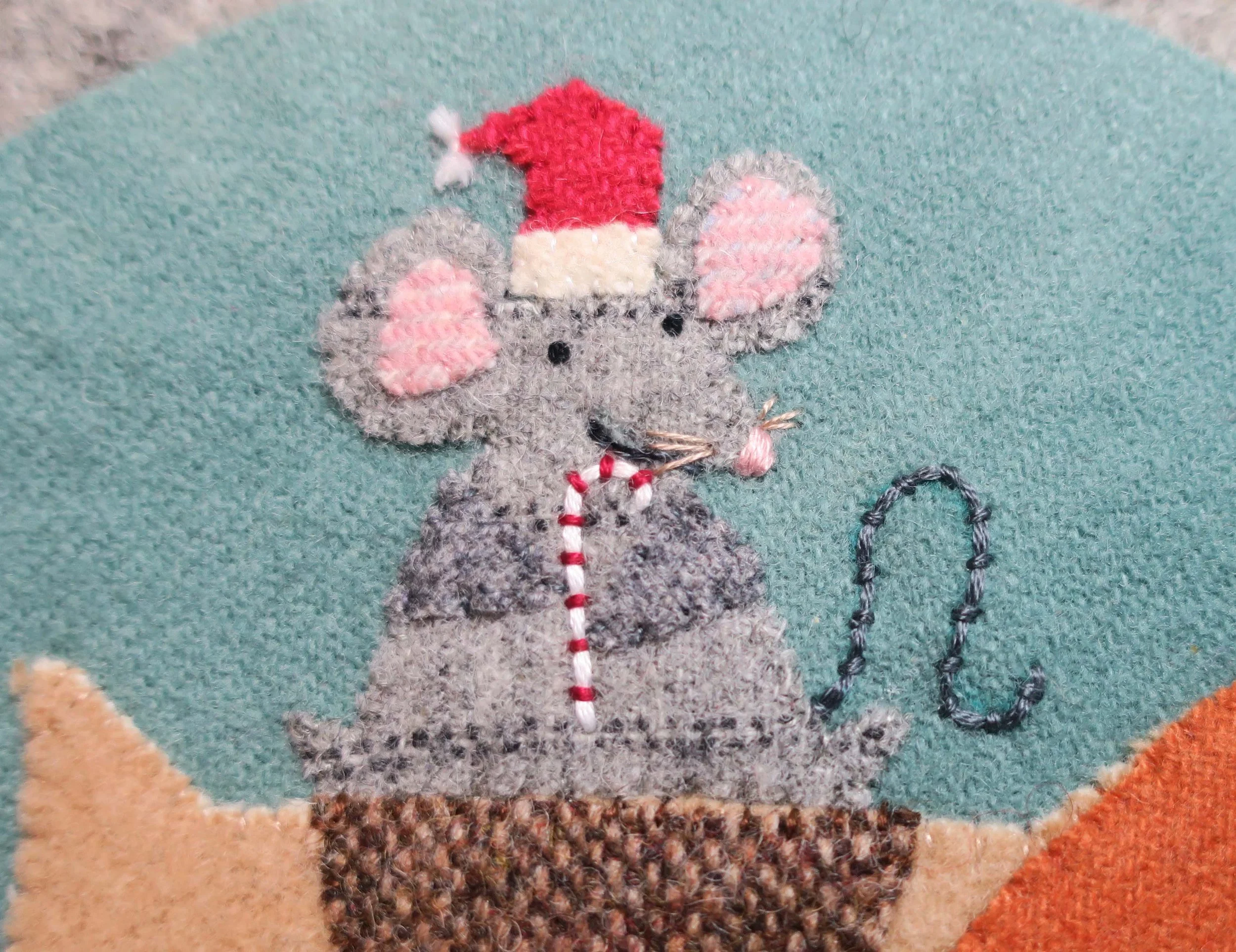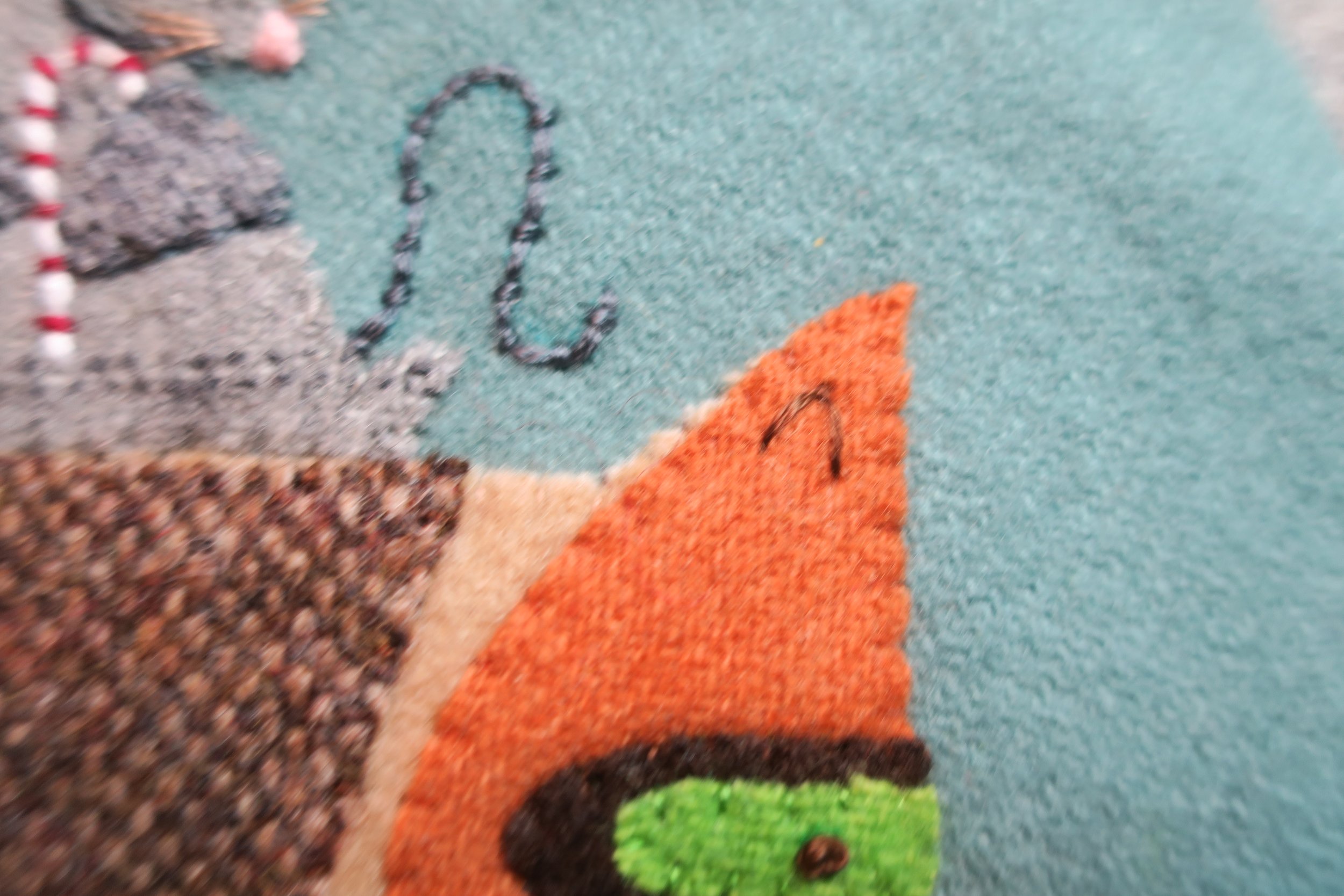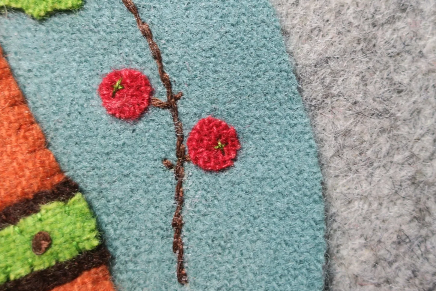 I used 6-strand embroidery floss for most of the stitching. The only exception is the blanket stitch border where I used black perle cotton, size 8. The floss threads match my wool colors.