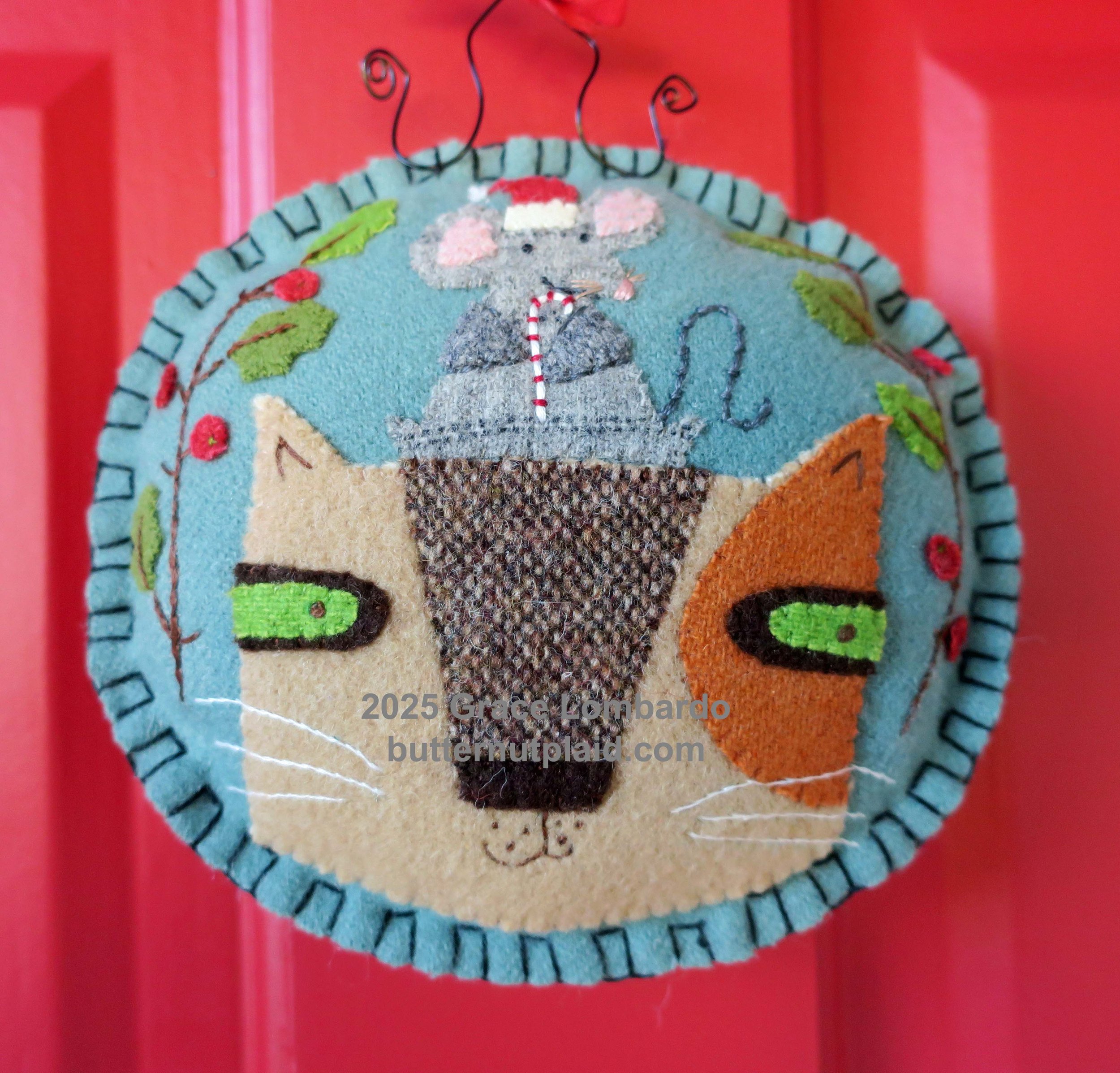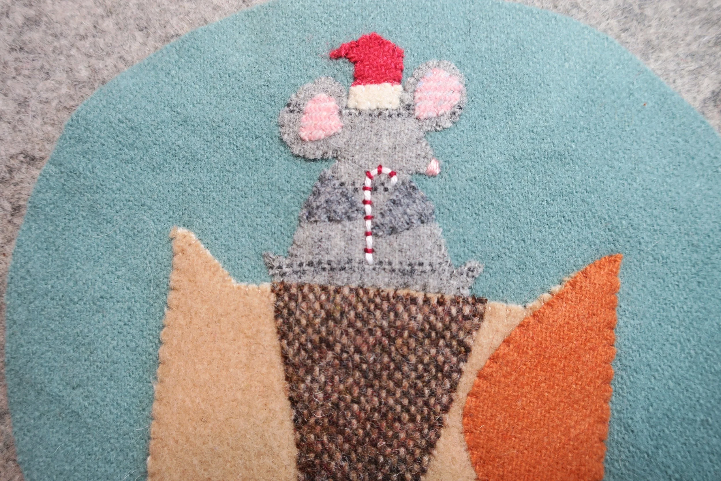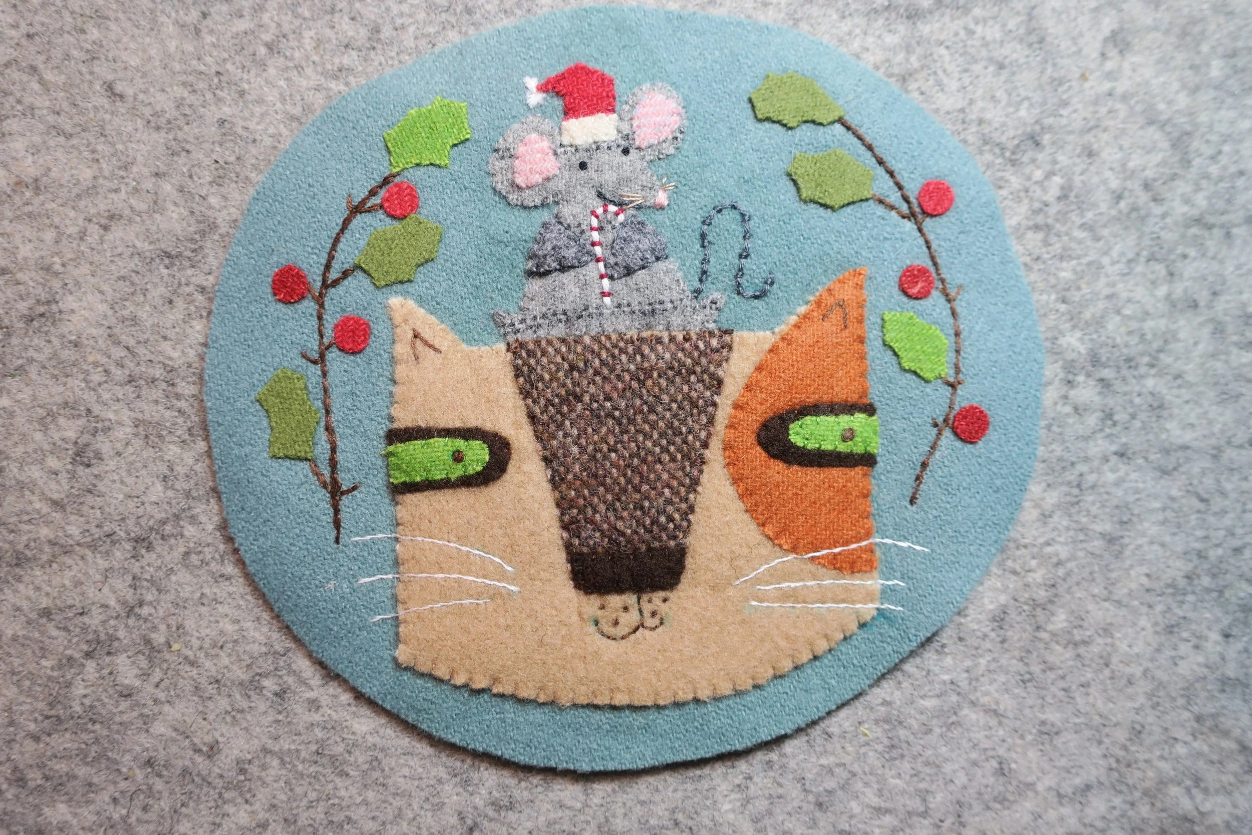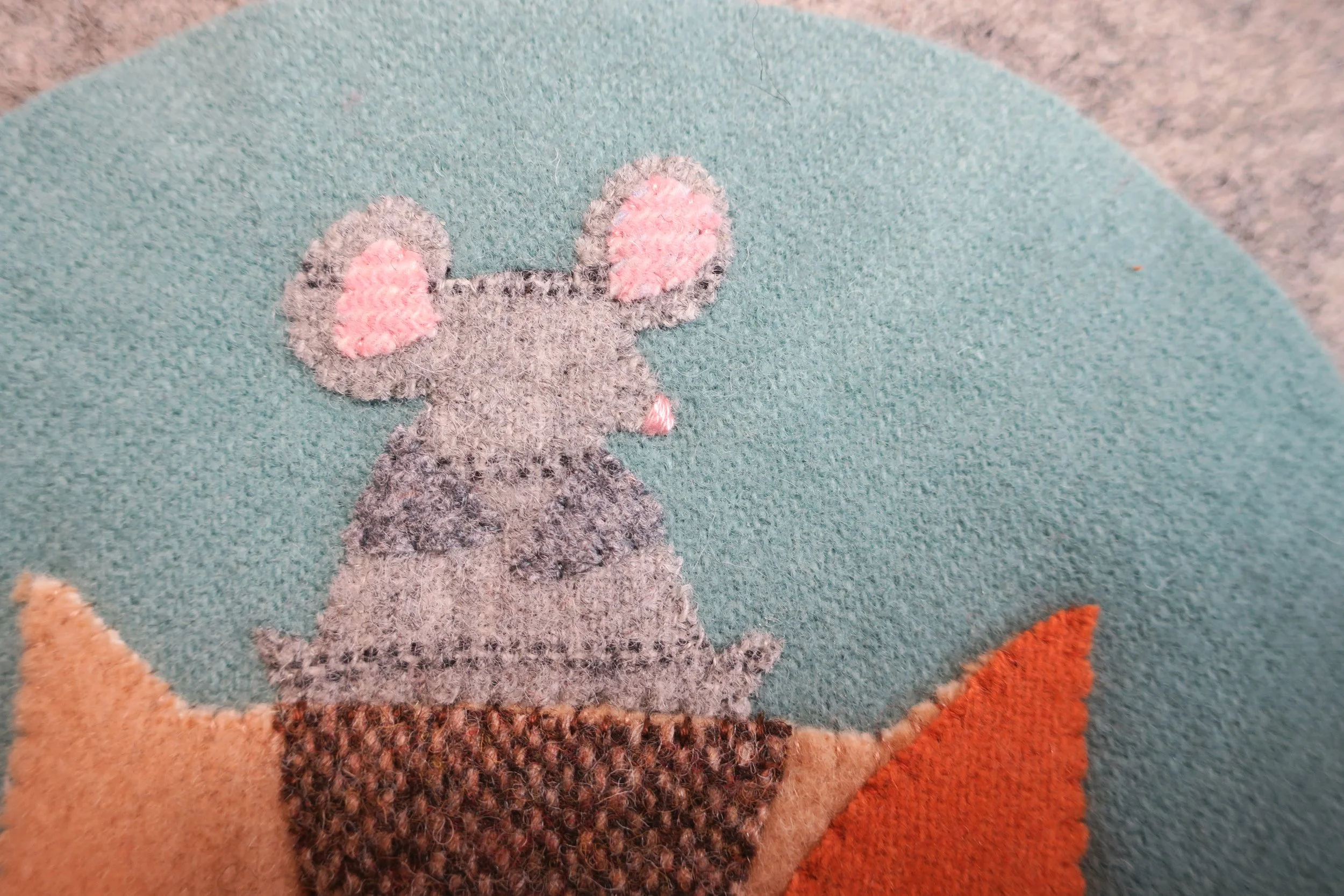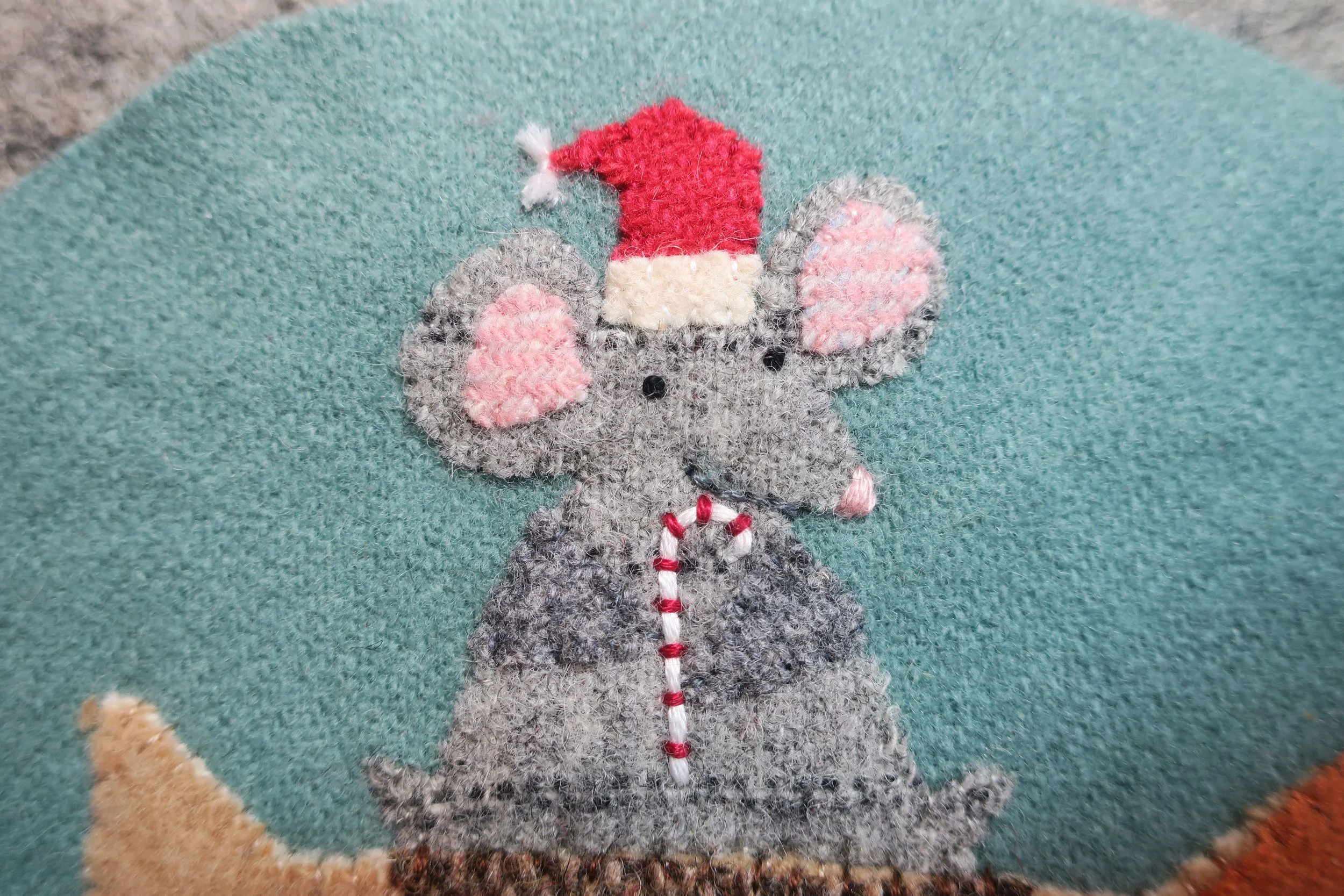 I used 6-strand embroidery floss for most of the stitching. The only exception is the blanket stitch border where I used black perle cotton, size 8. The floss threads match my wool colors.