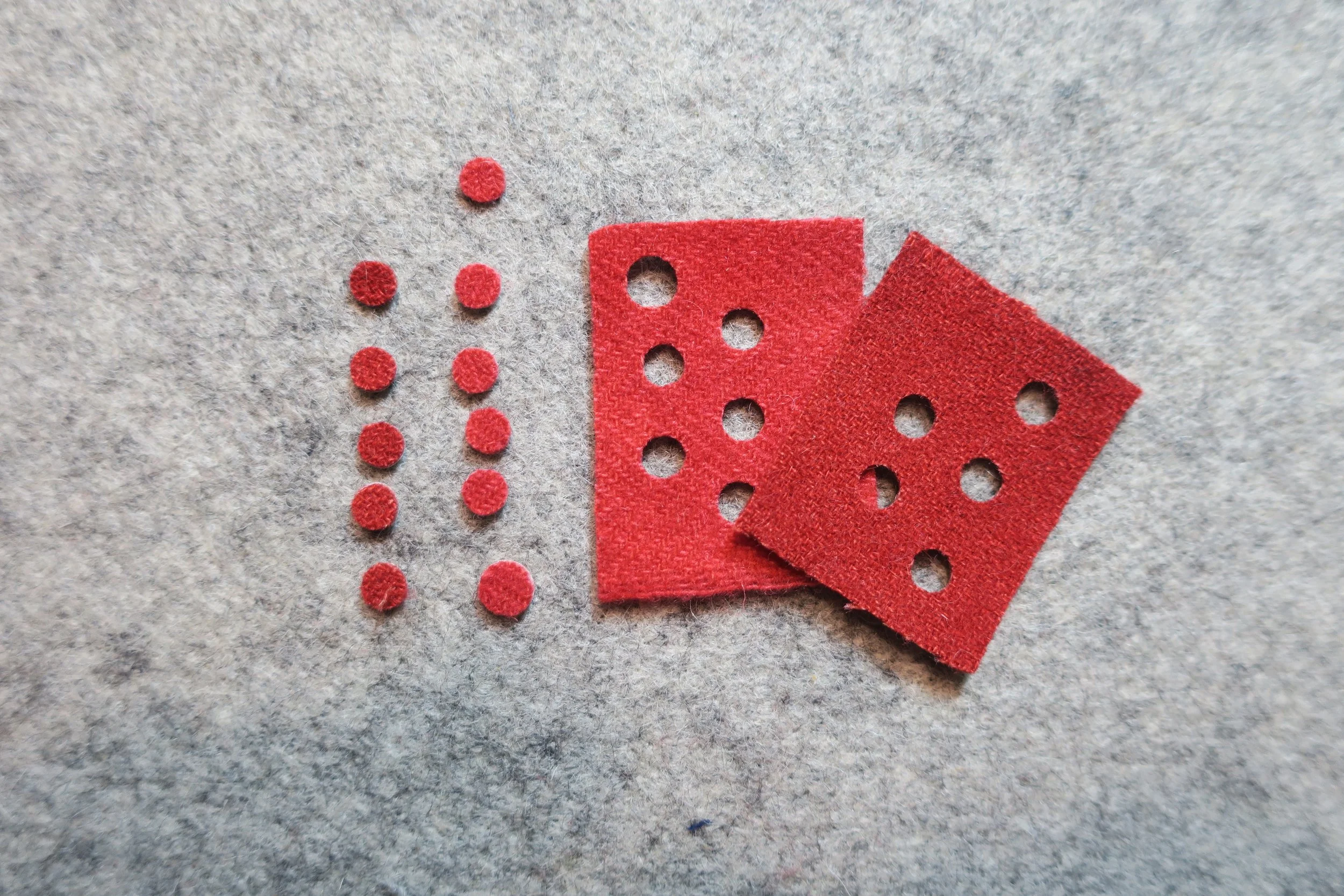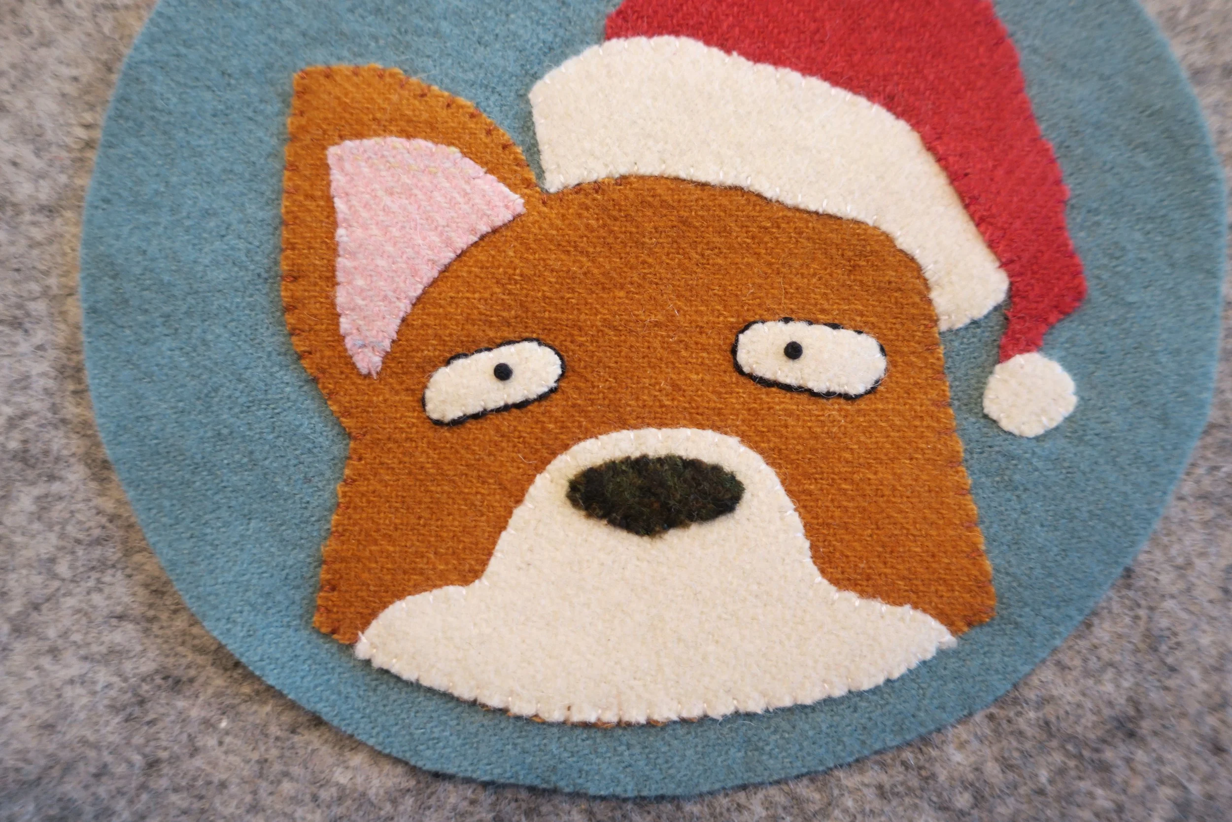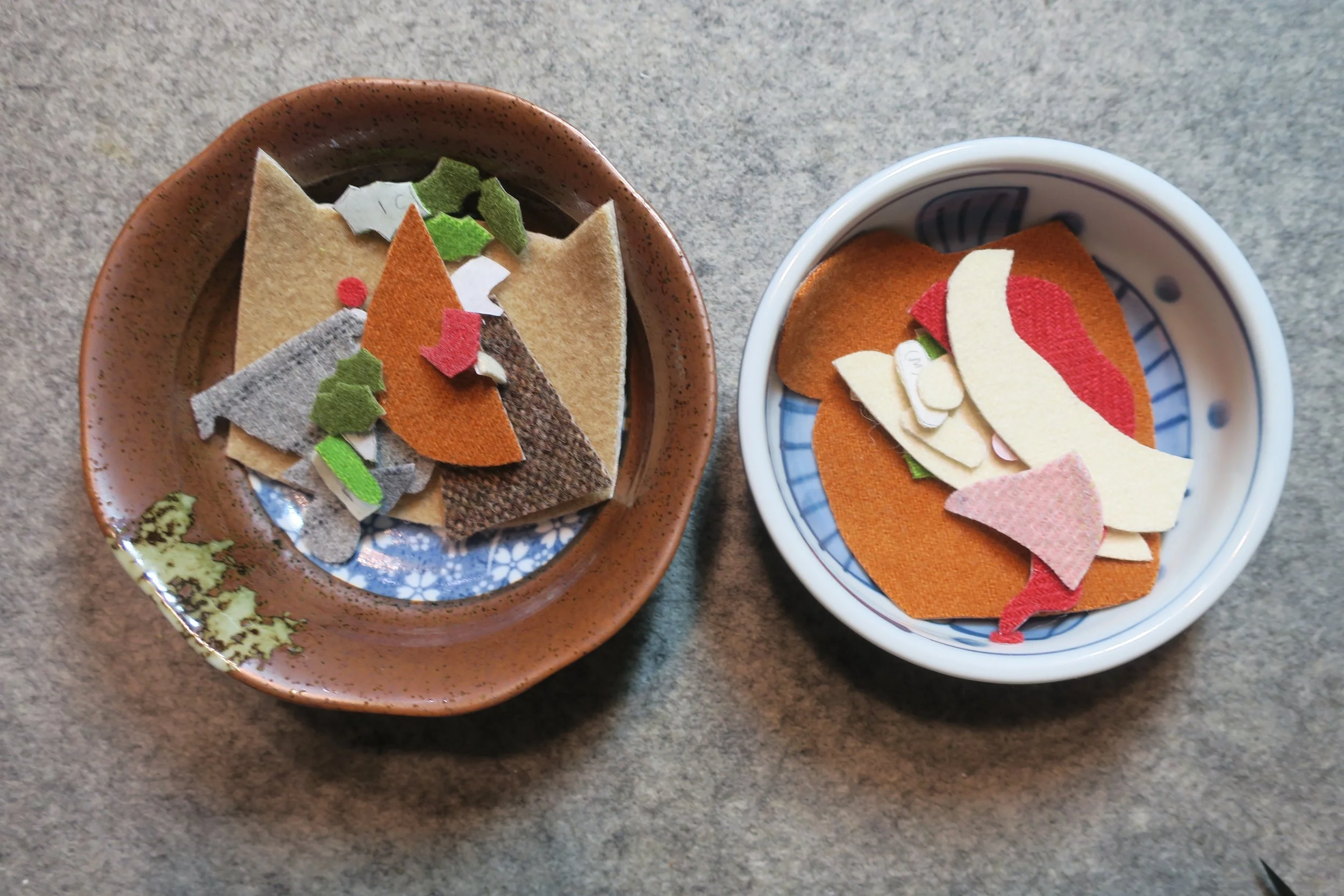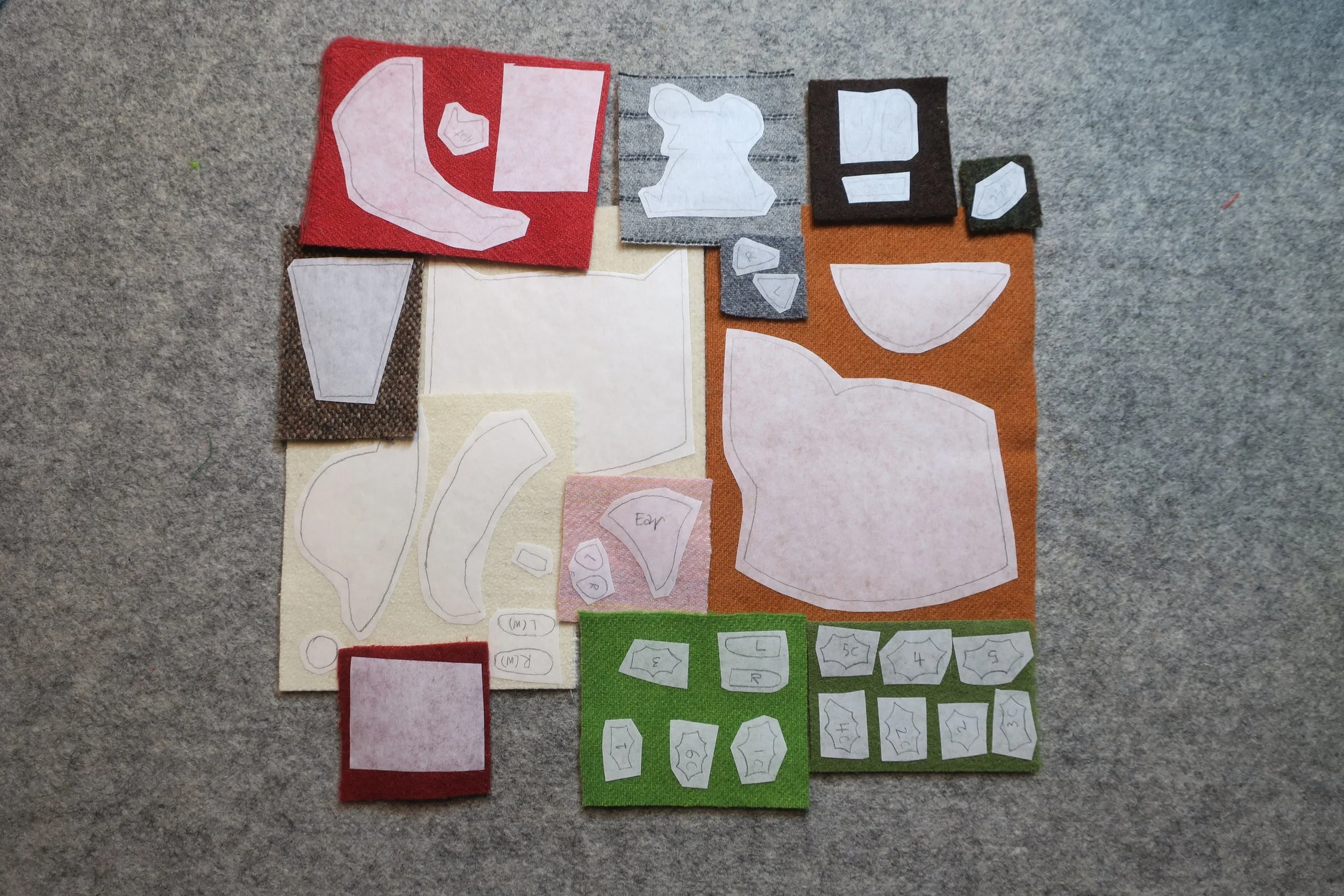7. Cut out wool applique pieces along the drawn lines. There are a lot of small pieces, so I put them in a small bowl, one for Snickers and one for Winston.