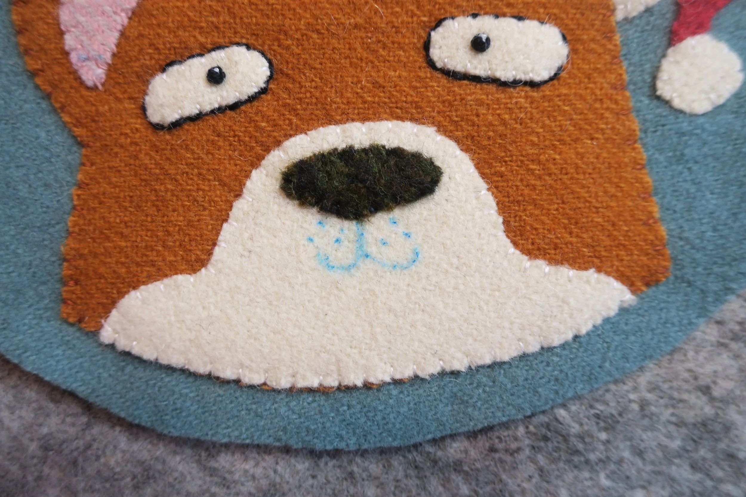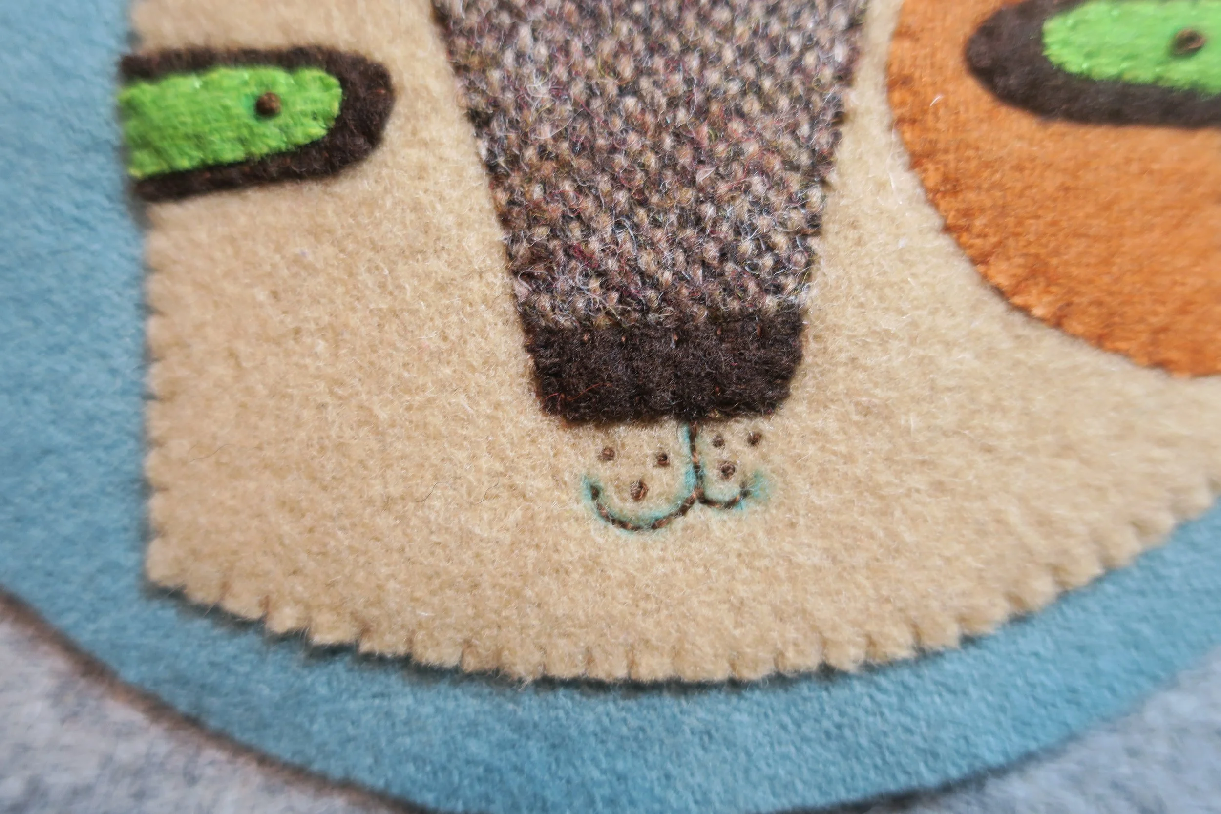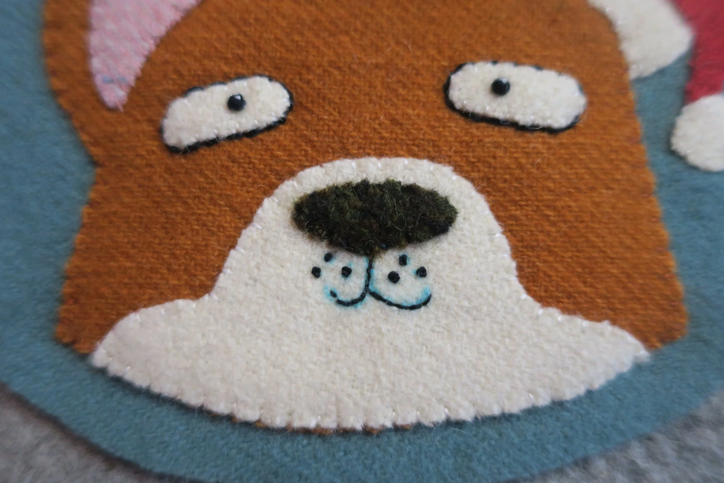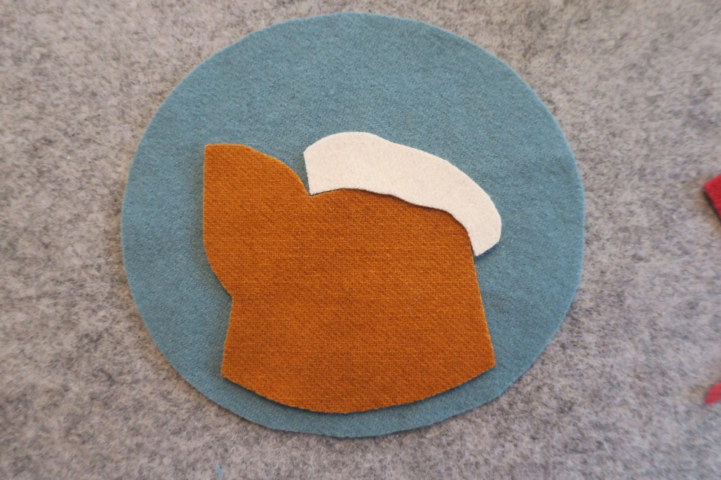9. Let’s start with Winston. Begin by removing the paper backing from his head, hat fur, and hat. Set your work space onto your ironing board or mat. Then center his neckline along the bottom of the background wool, leaving about a 3/8in space between the neckline and perimeter of the background.