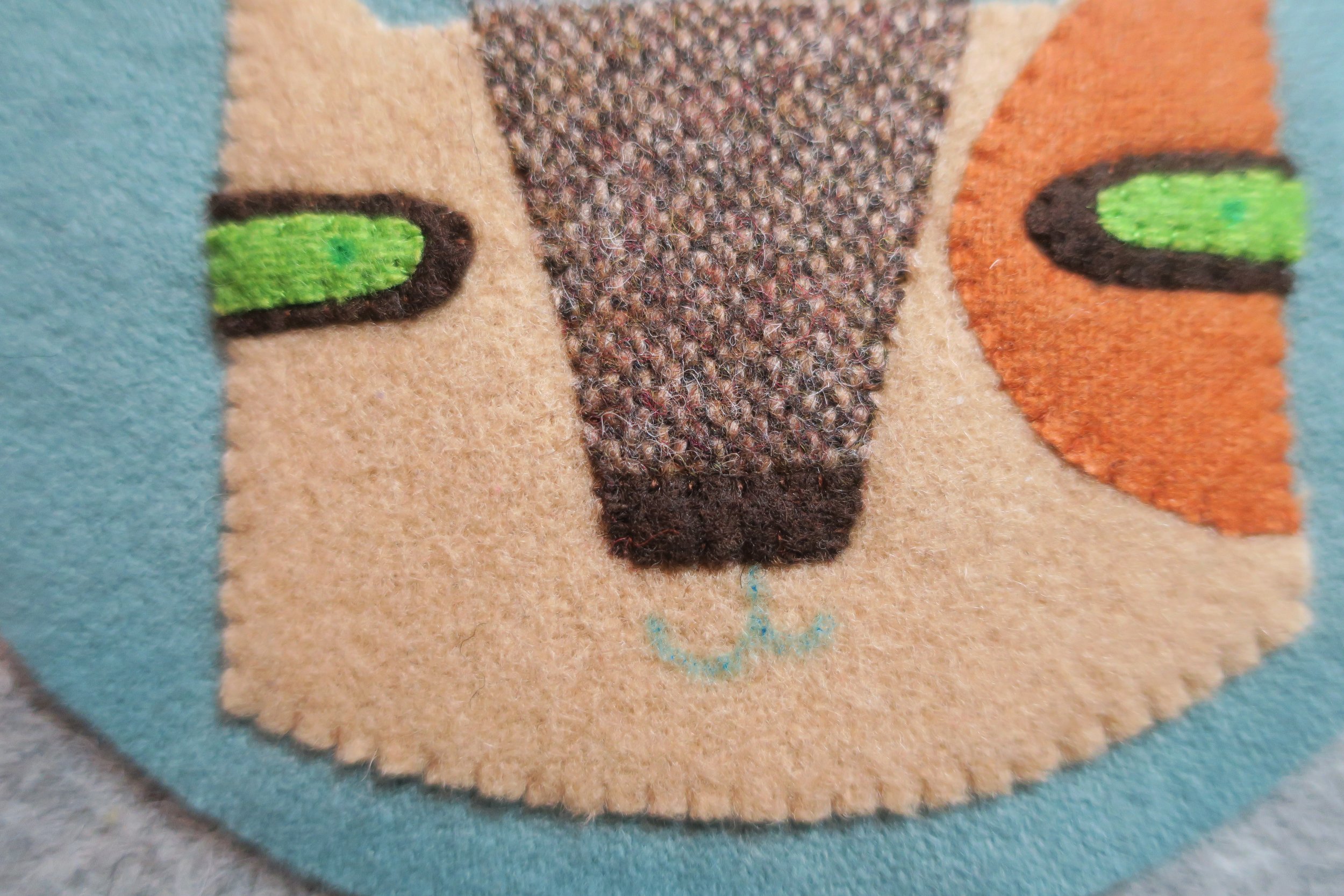 47. Postion the eyes (green wool) onto the outline wool. Press with steam, and then whip stitch with 1 strand of green floss to secure.
