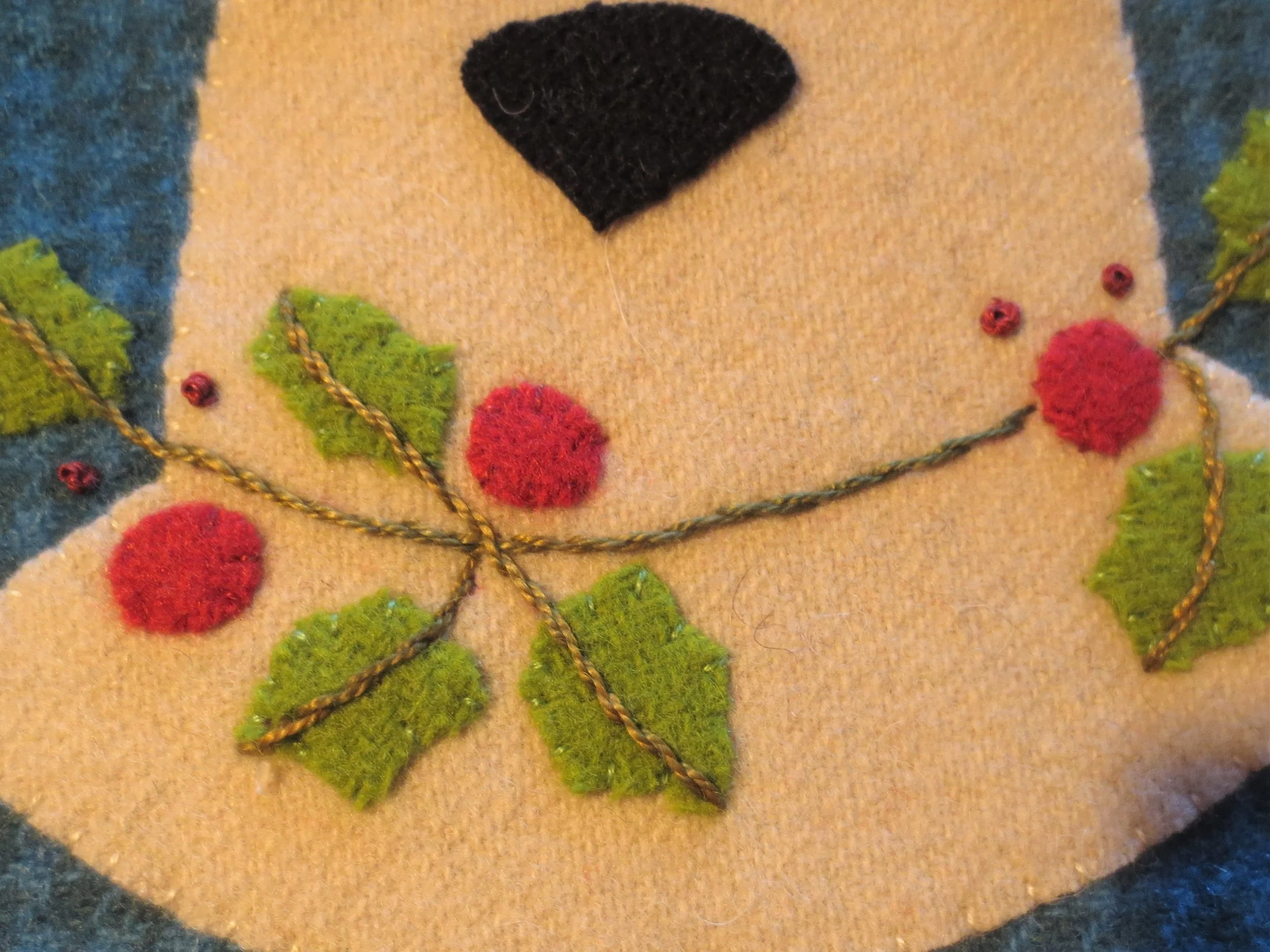 16. Whip stitch all the wool piece in place using 1 strand of embroidery floss in colors that match the wool.