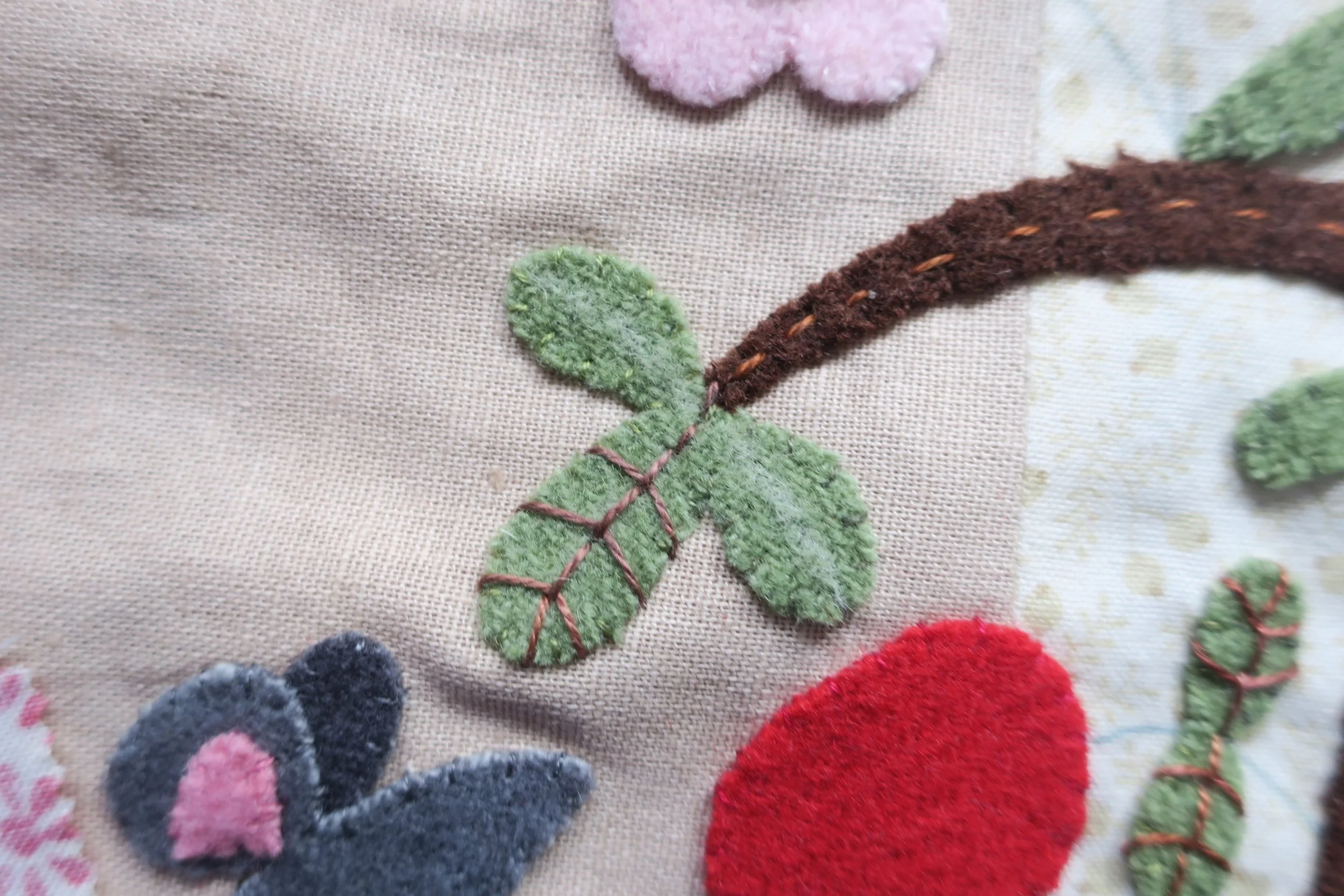 12. Whip stitch all the applique pieces (except the base pieces) with 1 strand of embroidery floss that matches your wool colors.